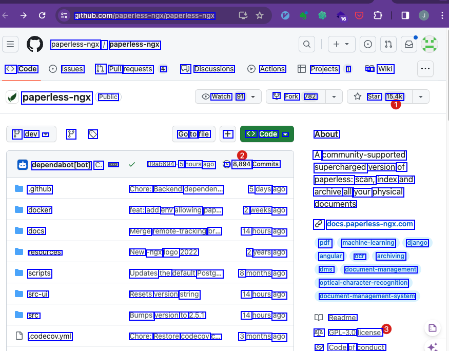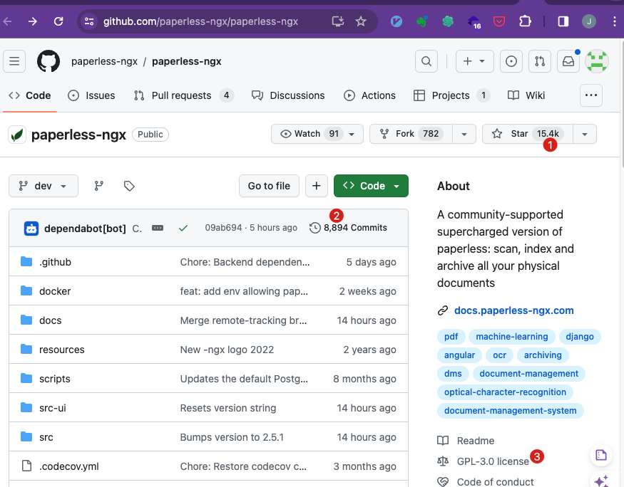 github.com/paperless-ngx/paperiess-ngx paperless-ngx / paperless-ngx <> Code Issues 81 Pull requests 4 2) Discussions Actions Projects 1 - LL Wiki paperless-ngx Public Watch 91 4 Fork 782 Star 15.4k 8 dev V 8 9 Go to file + <> Code V About A community-supported supercharged version of paperless: scan, index and archive all your physical documents dependabot/bot) C. : 09ab694 5 hours ago - 8,894 Commits .github docker docs Chore: Backend dependen... feat: add env allowing pap... Merge remote-tracking br... New -ngx logo 2022 5 days ago 2 weeks ago 14 hours ago 2 years ago 8 months ago 14 hours ago 14 hours ago 3 months ago € docs.paperless-ngs.com pdf machine-learning django angular ocr archiving dms document-management optca-character-recogniton document-management-system resources scripts src-ui src Updates the default Postg... Resets version string Bumps version to 2.5.1 Readme A GPL-3.0 license Code of conduct codecov.yml Chore: Restore codecov C...