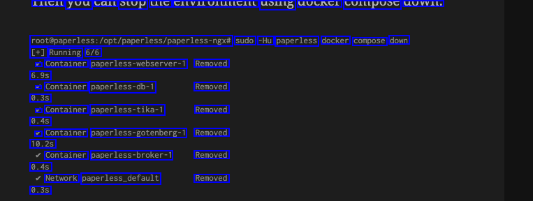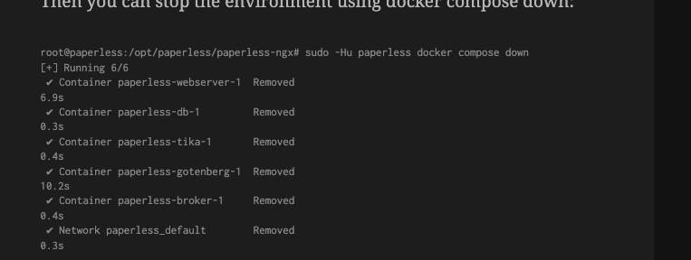LICIL you CCIL SLUP uC CIIVILUILLLCILL usH6 UCACI CUILLpUsE uUVVil. root@paperless:/opt/paperless/paperless-ngxe sudo -Hu paperless docker compose down [+] Running 6/6 - Container paperless-webserver-1 Removed 6.9s - Container paperless-db-1 Removed 0.3s - Container paperless-tika-1 Removed 0.4s / Container paperless-gotenberg1 Removed 10.2s Container paperless-broker-1 Removed 0.4s Network paperless.default Removed 0.3s