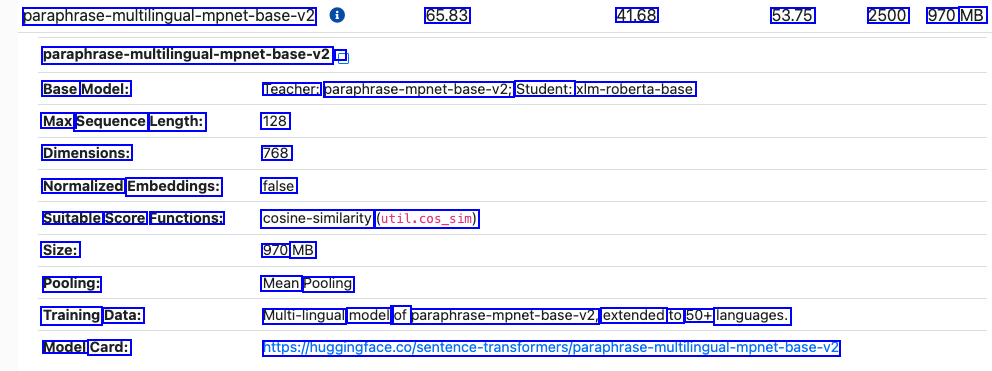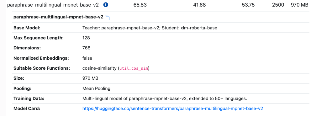 paraphrase-multlingual-mpnet-base-v2 65.83 41.68 53.75 2500 970 MB paraphrase-mutlingual-mpnet-base-v2 - Base Model: Teacher: paraphrase-mpnet-base-v2; Student: xlm-roberta-base Max Sequence Length: 128 Dimensions: 768 Normalized Embeddings: false Suitable Score Functions: cosine-similarity (util.cos_sim) Size: 970 MB Pooling: Mean Pooling Training Data: Multi-lingual model of paraphrase-mpnet-base-v2, extended to 50+ languages. Model Card: https:/huggingface.co/sentence-transformers/paraphrase-multilingual-mpnet-base-v2