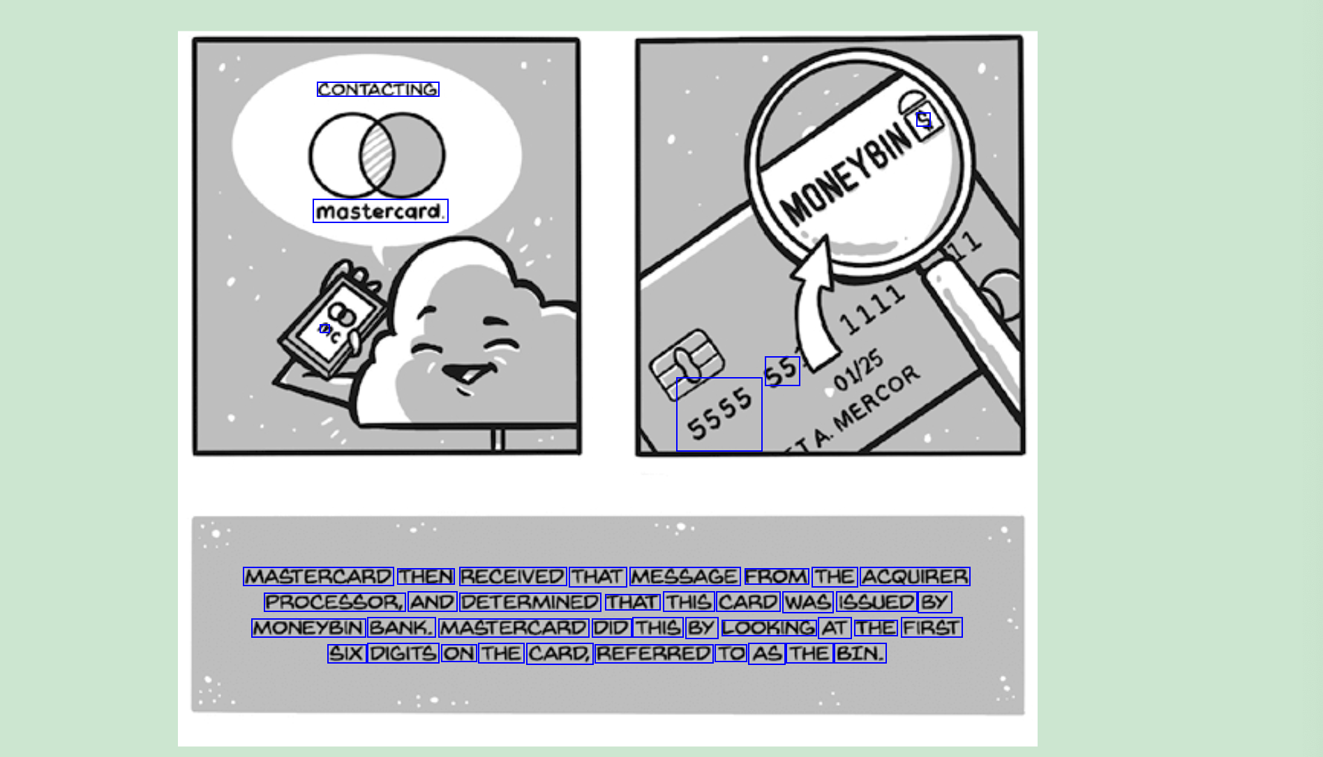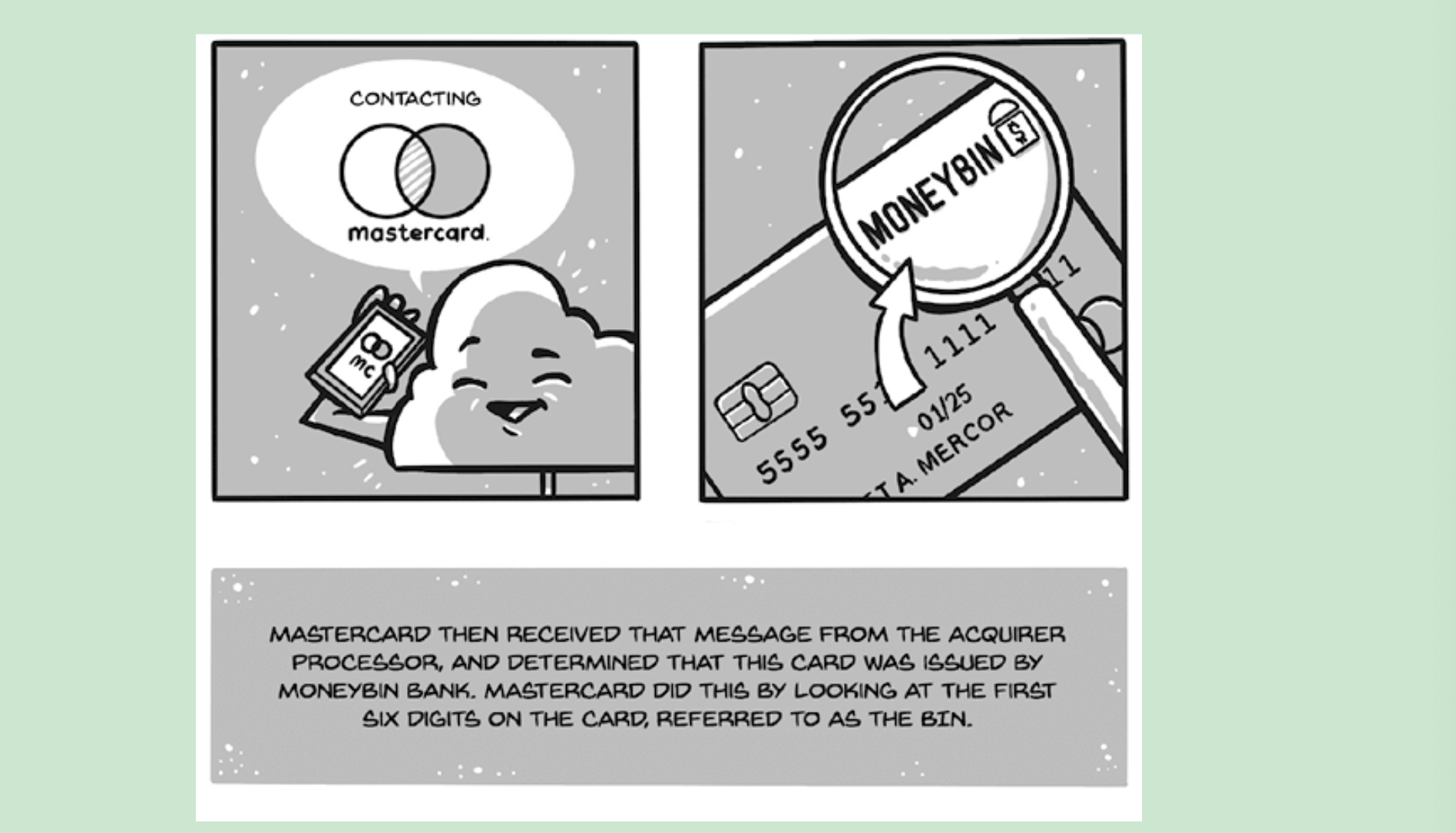 CONTACTING S mastercard. 2 55 5555 MASTERCARD THEN RECEIVED THAT MESSAGE FROM THE ACQUIRER PROCESSOR, AND DETERMINED THAT THIS CARD WAS ISSUED BY MONEYBIN BANK. MASTERCARD DID THIS BY LOOKING AT THE FIRST SIX DIGITS ON THE CARD, REFERRED TO AS THE BIN.