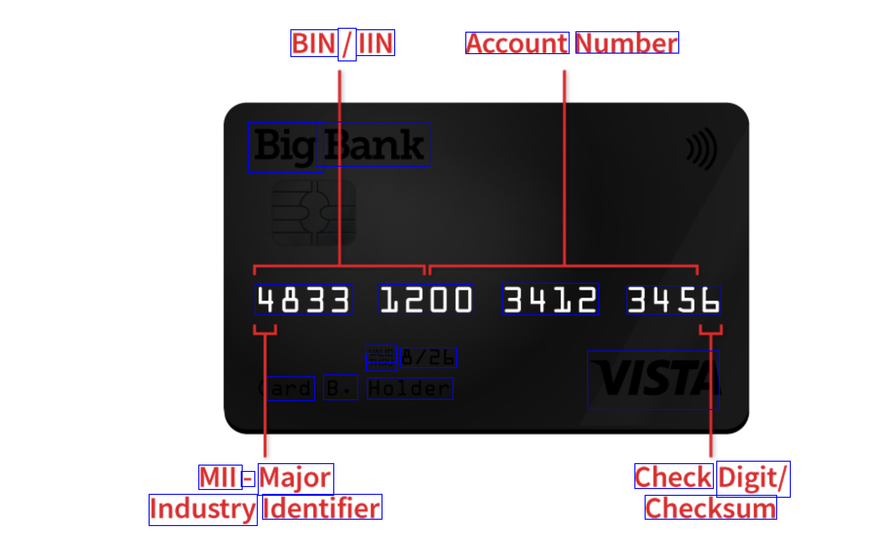 BIN / IIN Account Number Big Bank 4833 1200 3412 3455 VALID THRU 8/26 ard B. Holder VISTA MII - Major Check Digit/ Checksum Industry Identifier