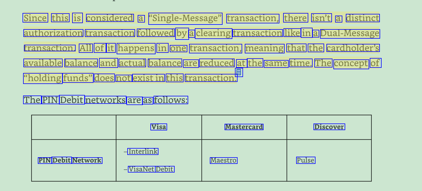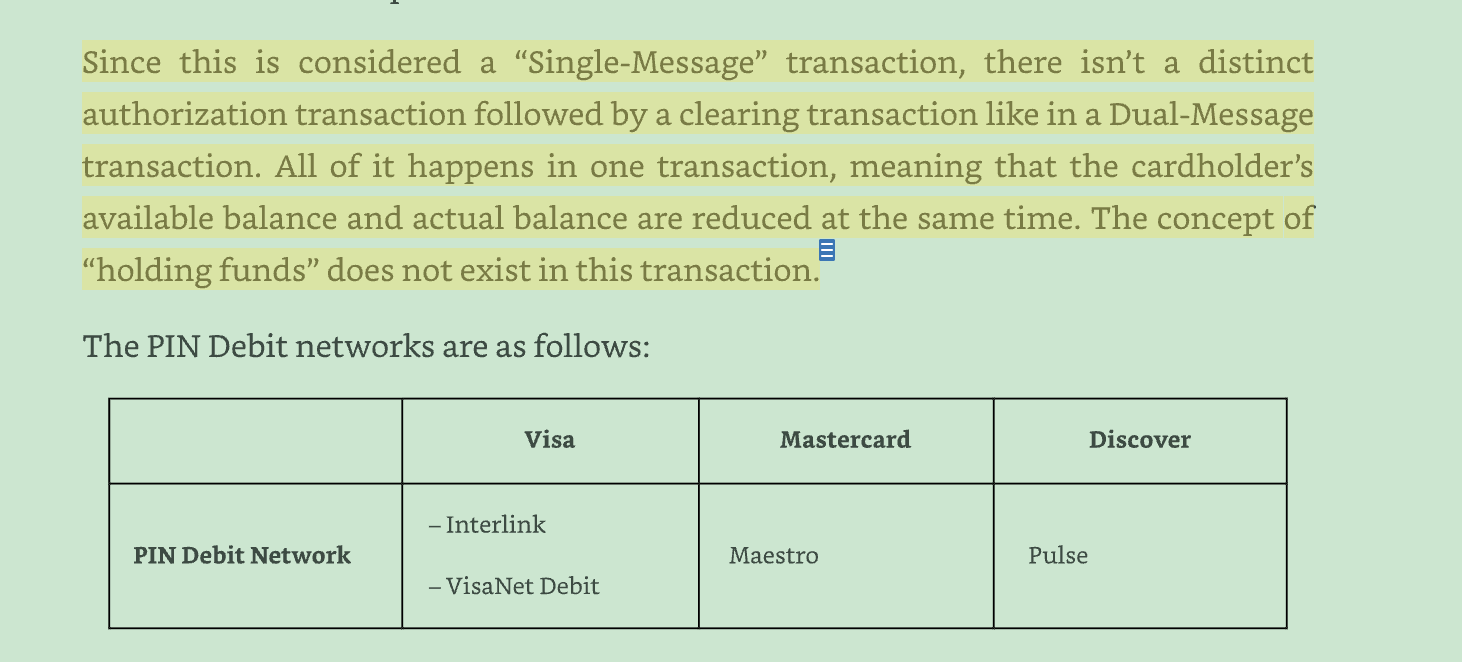 Since this is considered a "Single-Message" transaction, there isn't a distinct authorization transaction followed by a clearing transaction like in a Dual-Message transaction. All of it happens in one transaction, meaning that the cardholder's available balance and actual balance are reduced at the same time. The concept of E "holding funds" does not existin this transaction. The PIN Debit networks are as follows: Visa Mastercard Discover Interlink PIN Debit Network Maestro Pulse VisaNet Debit