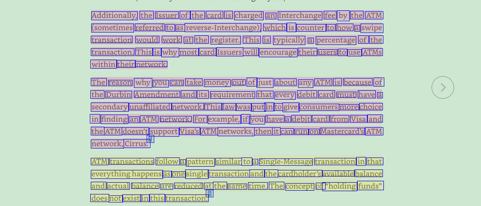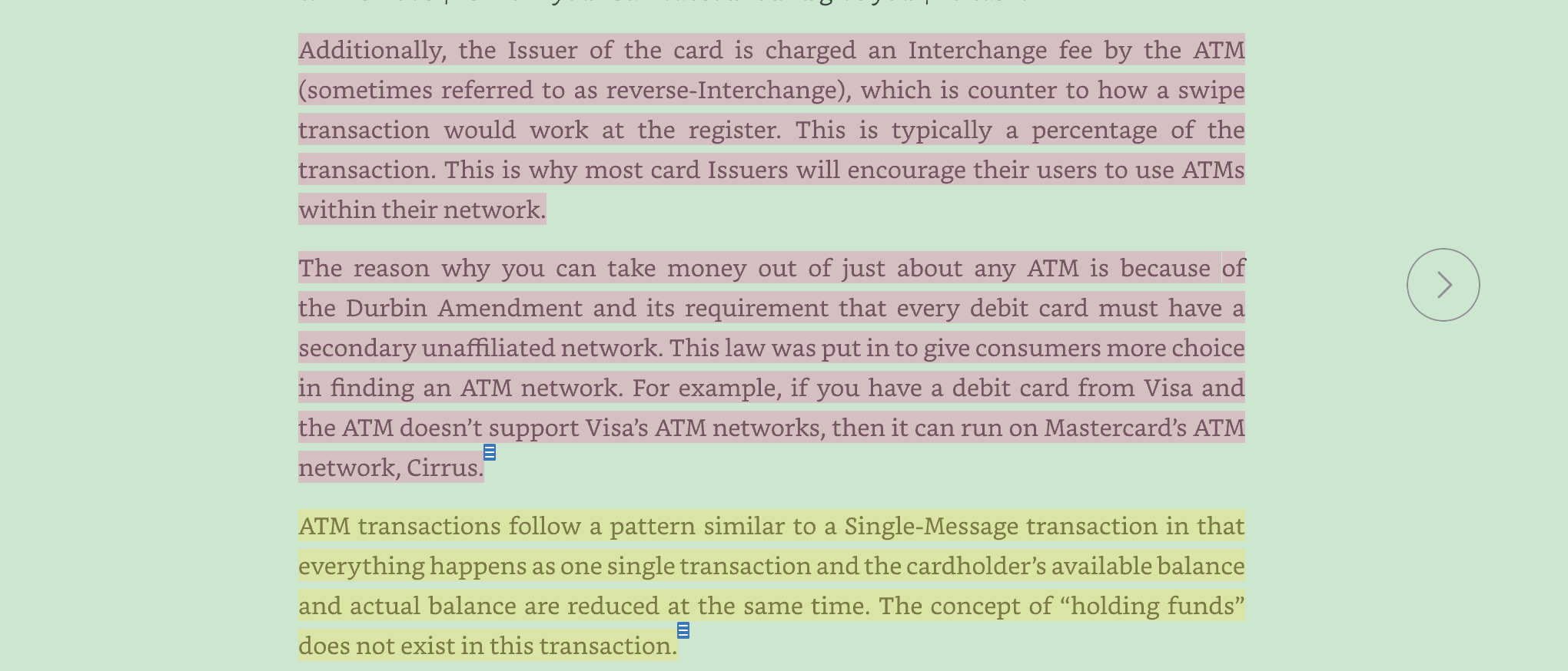 Additionally, the Issuer of the card is charged an Interchange fee by the ATM (sometimes referred to as reverse-Interchange, which is counter to how a swipe transaction would work at the register. This is typically a percentage of the transaction. This is why most card Issuers will encourage their users to use ATMs within their network. The reason why you can take money out of just about any ATM is because of the Durbin Amendment and its requirement that every debit card must have a secondary unaffiliated network. This law was put in to give consumers more choice in finding an ATM network. For example, if you have a debit card from Visa and the ATM doesn't support Visa's ATM networks, then it can run on Mastercard's ATM E network, Cirrus. ATM transactions follow a pattern similar to a Single-Message transaction in that everythinghappens as one single transaction and the cardholder's available balance and actual balance are reduced at the same time. The concept of "holding funds" E does not exist in this transaction.