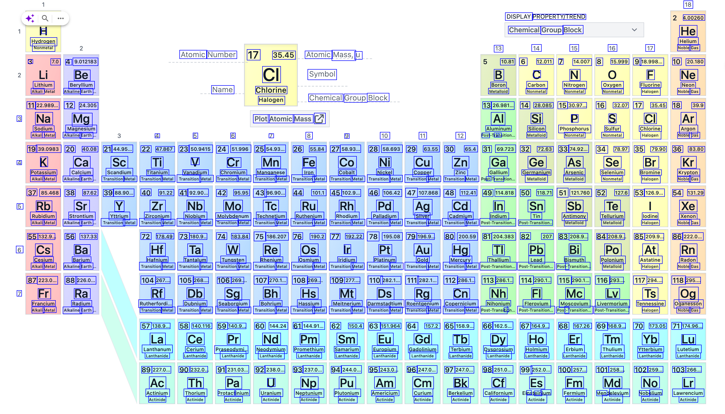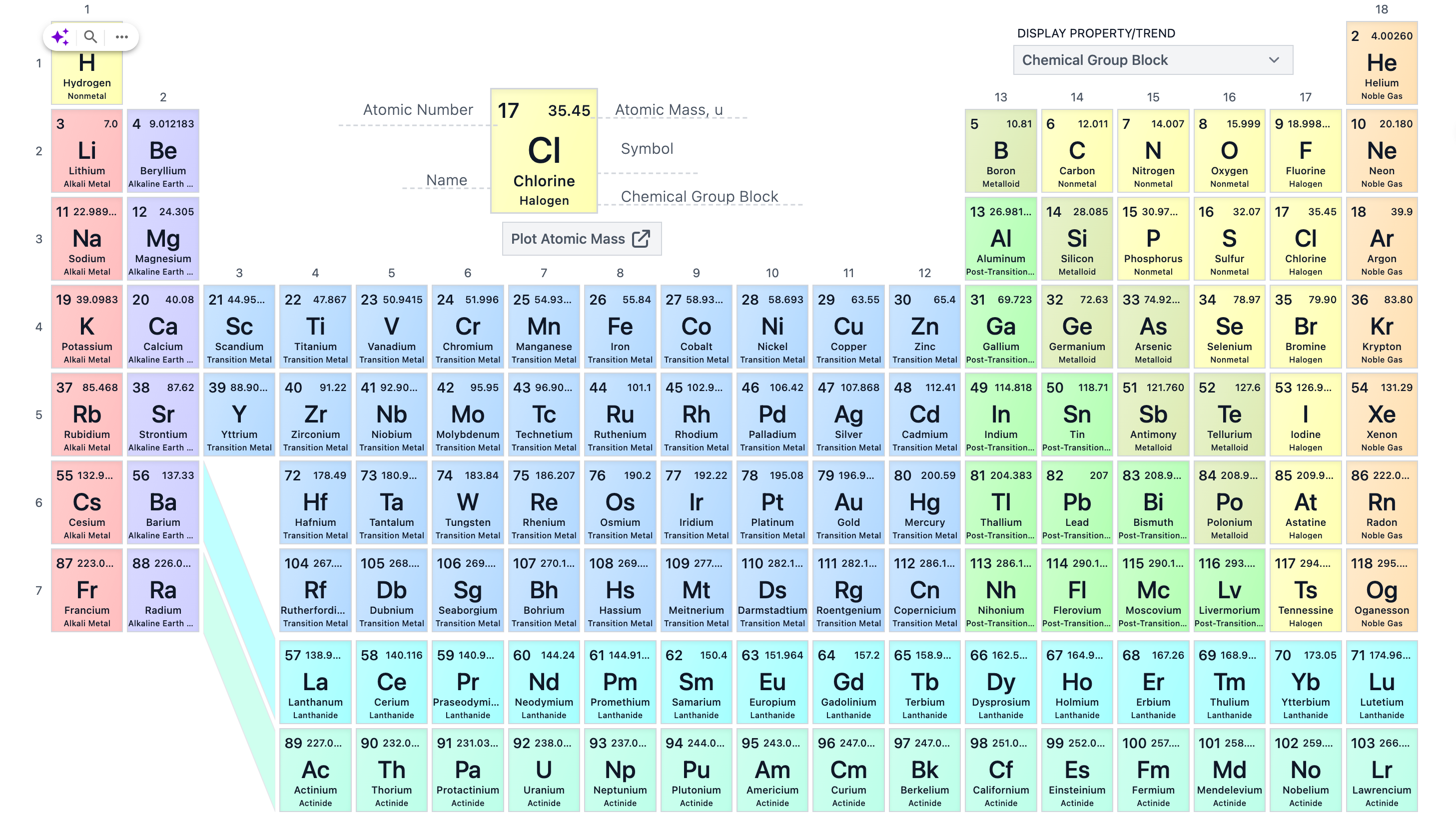 18 4.00260 He Helium 17 Noble Gas DISPLAY PROPERTY/TREND Chemical Group Block 13 14 15 16 B C N - Hydrogen Nonmetal 3 7.0 4 9.012183 Be Lithium Beryllium Alkali Alkaline Earth 11 22.989... 12 24.305 3 Na Mg Sodium Magnesium Alkali Metal Alkaline Earth Atomic Number 17 35.45 Atomic Mass, u 10.81 6 12.011 7 14.007 8 15.999 9 18.998... 10 20.180 Boron Carbon Nitrogen Oxygen Fluorine Neon Metalloid Nonmetal Nonmetal Nonmetal Halogen Noble Gas 13 26.981... 14 28.085 15 30.97... 16 32.07 17 35.45 18 39.9 Aluminum Silicon Phosphorus Sulfur Chlorine Argon Metalloid Nonmetal Nonmetal Halogen Noble Gas CI Symbol F Ne Name Chlorine Halogen Chemical Group Block Plot Atomic Mass E 4 5 6 7 8 9 10 11 V Al Si P S 12 Post rai ns CI Ar 19 39.0983 20 40.08 21 44.95... 22 47.867 23 50.9415 24 51.996 25 54.93... 26 55.84 27 58.93... 28 58.693 29 63.55 30 65.4 31 69.723 32 72.63 33 74.92... 34 78.97 35 79.90 36 83.80 Potassium Calcium Scandium Titanium Vanadium Chromium Manganese Iron Cobalt Nickel Copper Zinc Gallium Germanium Arsenic Selenium Bromine Krypton Alkali Metal Alkaline Earth Transition Metal Transition Metal Transition Metal Transition Metal Transition Metal Transition Metal Transition Metal Transition Metal Transition Metal Transition Metal st ransi Metalloid Metalloid Nonmetal Halogen Noble Gas 37 85.468 38 87.62 39 88.90... 40 91.22 41 92.90... 42 95.95 43 96.90... 44 101.1 45 102.9... 46 106.42 47 107.868 48 112.41 49 114.818 50 118.71 51 121.760 52 127.6 53 126.9... 54 131.29 Rubidium Strontium Yttrium Zirconium Niobium Molybdenum Technetium Ruthenium Rhodium Palladium Silver Cadmium Indium Tin Antimony Tellurium lodine Xenon Alkali Metal Alkaline Earth Transition Metal Transition Metal Transition Metal Transition Metal Transition Metal Transition Metal Transition Metal Transition Metal Transition Metal Transition Metal Post-Transition.. Post-Transition.. Metalloid Metalloid Halogen Noble Gas 4 K Ca Sc Ti Cr Mn Fe Co Ni Cu Zn Ga Ge As Se Br Kr 5 Rb Sr Y Zr Nb Mo Tc Ru Rh Pd Ag Cd In Sn Sb Te Xe 55 132.9.. 56 137.33 6 Cs Ba Cesium Barium Alkali Metal Alkaline Earth 87 223.0... 88 226.0... 7 Fr Ra Francium Radium Alkali Metal Alkaline Earth 72 178.49 73 180.9.. 74 183.84 75 186.207 76 190.2 77 192.22 78 195.08 79 196.9.. 80 200.59 81 204.383 82 207 83 208.9... 84 208.9.. 85 209.9... 86 222.0... Hafnium Tantalum Tungsten Rhenium Osmium Iridium Platinum Gold Mercury Thallium Lead Bismuth Polonium Astatine Radon Transition Metal Transition Metal Transition Metal Transition Metal Transition Metal Transition Metal Transition Metal Transition Metal Transition Metal Post-Transition. Post-Transition. Post-1 -Transition.. Metalloid Halogen Noble Gas 104 267.... 105 268.... 106 269.. 107 270.1... 108 269.. 109 277.... 110 282.1... 111 282.1... 112 286.1.. 113 286.1.. 114 290.1... 115 290.1... 116 293... 117 294.... 118 295.... Rf Db Sg Bh Hs Mt Ds Rg Cn Nh FI Mc Lv Ts Og Rutherfordi.. Dubnium Seaborgium Bohrium Hassium Meitnerium Darmstadtium Roentgenium Copernicium Nihonium Flerovium Moscovium Livermorium Tennessine Oganesson Transition Metal Transition Metal Transition Metal Transition Metal Transition Metal Transition Metal Transition Metal Transition Metal Transition Metal Post-Transiti tic Post-Transition. Post-1 -Transition... Post-Transition.. Halogen Noble Gas 57 138.9... 58 140.116 59 140.9... 60 144.24 61 144.91... 62 150.4 63 151.964 64 157.2 65 158.9... 66 162.5... 67 164.9... 68 167.26 69 168.9... 70 173.05 71 174.96... La Ce Pr Nd Pm Sm Eu Gd Tb Dy Ho Er Tm Yb Lu Lanthanum Cerium Praseodymi.. Neodymium Promethium Samarium Europium Gadolinium Terbium Dysprosium Holmium Erbium Thulium Ytterbium Lutetium Lanthanide Lanthanide Lanthanide Lanthanide Lanthanide Lanthanide Lanthanide Lanthanide Lanthanide Lanthanide Lanthanide Lanthanide Lanthanide Lanthanide Lanthanide 89 227.0... 90 232.0.. 91 231.03... 92 238.0... 93 237.0... 94 244.0... 95 243.0.. 96 247.0... 97 247.0... 98 251.0... 99 252.0... 100 257... 101 258... 102 259... 103 266... Actinium Thorium Protact inium Uranium Neptunium Plutonium Americium Curium Berkelium Californium ns ein ium Fermium Men elevium Nobe elium Lawrencium Actinide Actinide Actinide Actinide Actinide Actinide Actinide Actinide Actinide Actinide Actinide Actinide Actinide Actinide Actinide Hf Ta W Re Os Ir Pt Au Hg TI Pb Bi Po At Rn Ac Th Pa U Np Pu Am Cm Bk Cf Es Fm Md No Lr