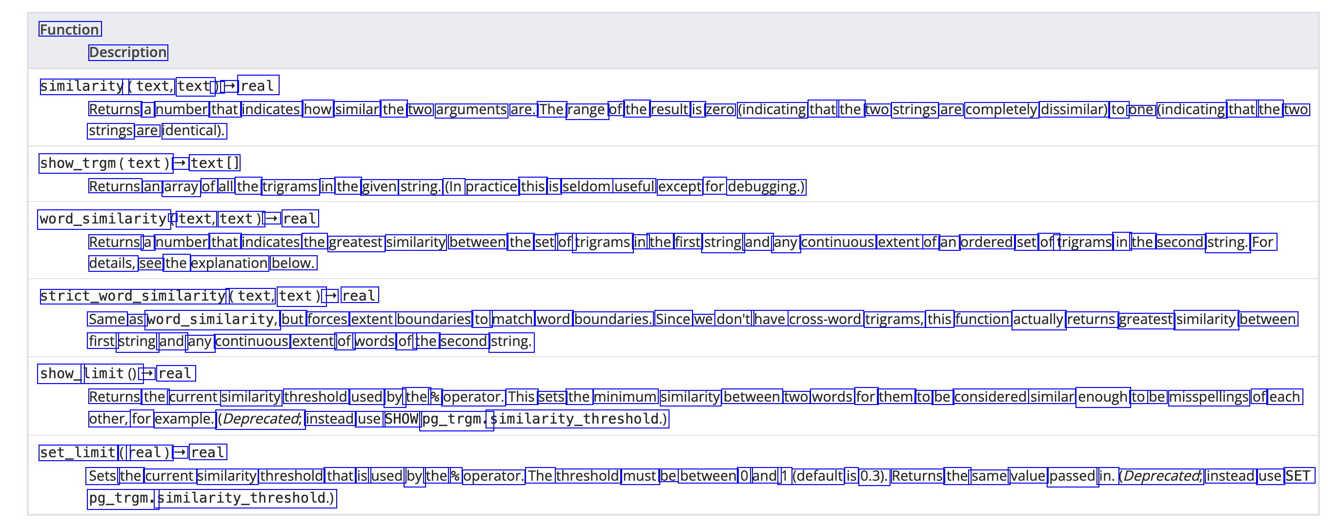 Function Description similarity (text, text ) + real Returns a number that indicates how similar the two arguments are. The range of the result is zero (indicating that the two strings are completely dissimilar) to one (indicating that the two strings are identical). show_trgm(text) + text[] Returns an array of all the trigrams in the given string. (In practice this is seldom useful except for debugging.) word_similarity ( text, text) + real Returns a number that indicates the greatest similarity between the set of trigrams in the first string and any continuous extent of an ordered set oft trigrams in the second string. For details, see the explanation below. strict_word_similarity (text, text) + real Same as word_similarity, but forces extent boundaries to match word boundaries. Since we don't have cross-word trigrams, this function actually returns greatest similarity between first string and any continuous extent of words of the second string. show_ limit0 + real Returns the current similarity threshold used by the % operator. This sets the minimum similarity between two words for them to be considered similar enough to be misspellings of each other, for example. (Deprecated; instead use SHOW pg_trgm. similarity.threshold) set_limit ( real) - real Sets the current similarity threshold that is used by the % operator. The threshold must be between 0 and 1 (default is 0.3). Returns the same value passed in. (Deprecated; instead use SET pg_trgm. similarity.threshold)