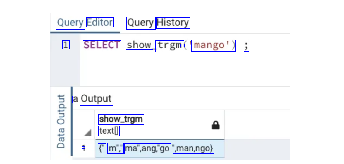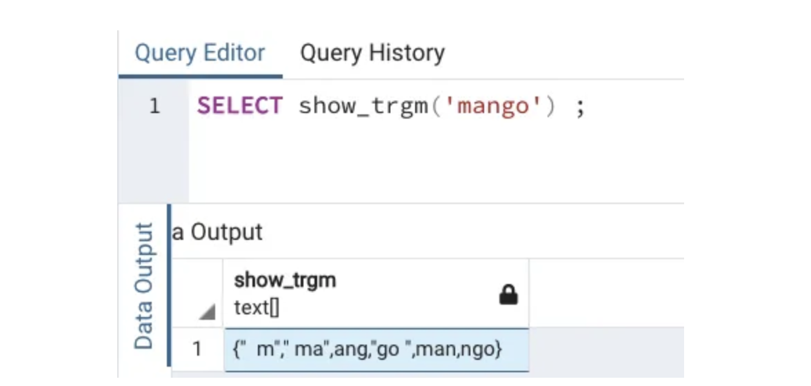Query Editor Query History 1 SELECT show trgm - mango') ; a Output show_trgm text] I - f" m"," ma",ang,'go man,ngo)