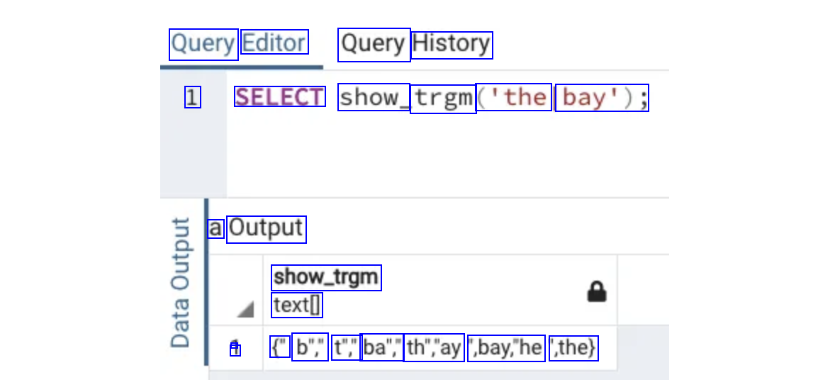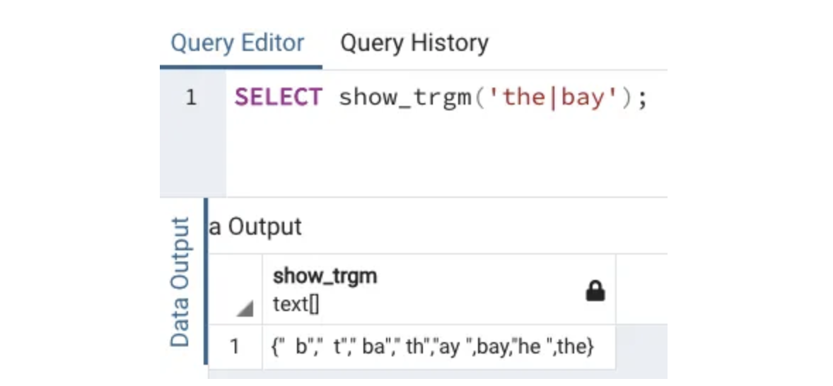 Query Editor Query History 1 SELECT show_ trgm ('the bay'); a Output show_trgm text] I - (" b", t", ba", th","ay "bay"he the)