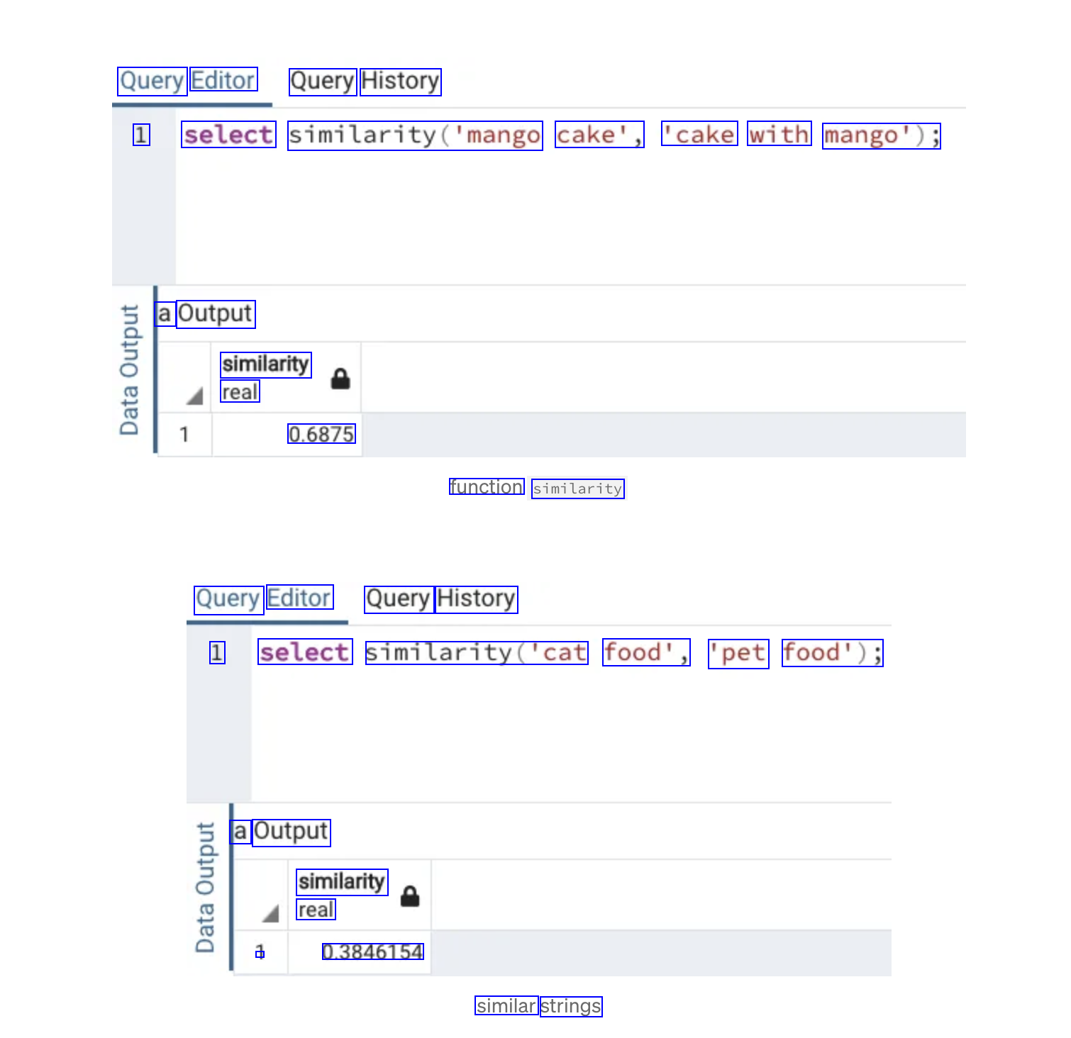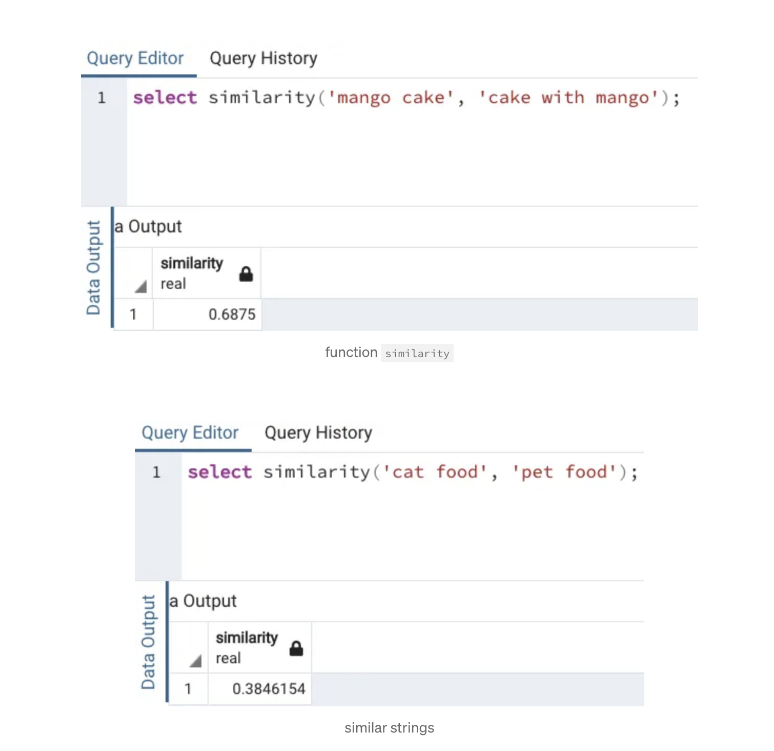Query Editor Query History 1 select similarity('mango cake', 'cake with mango'); a Output similarity real 0.6875 function similarity Query Editor Query History 1 select similarity('cat food', 'pet food'); a Output similarity real - 0.3846154 similar strings