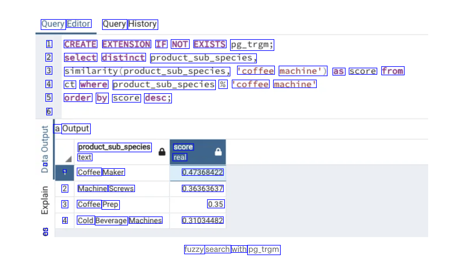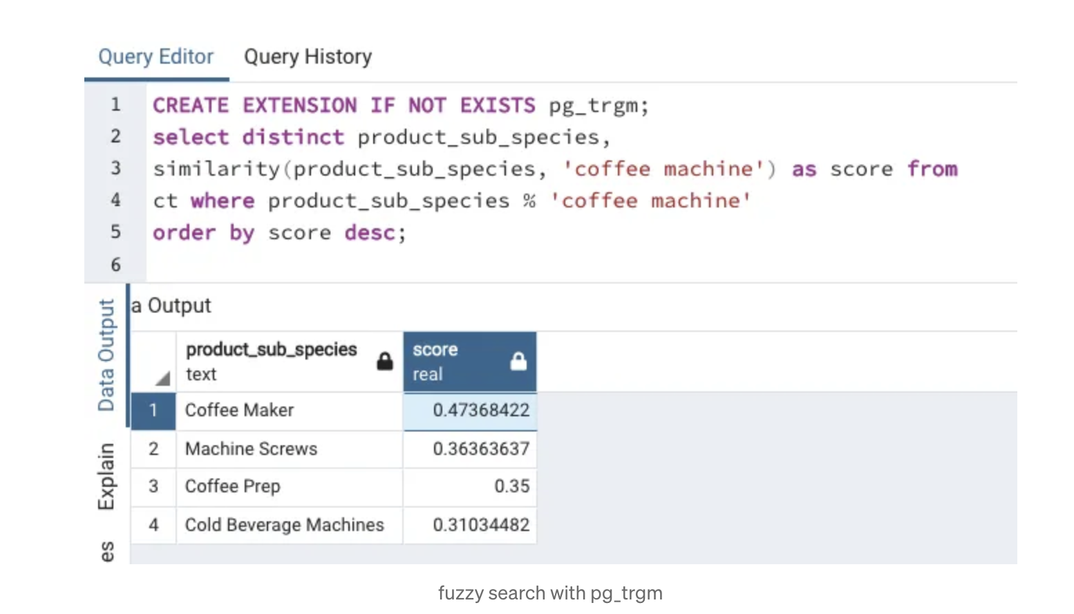 Query Editor Query History 1 CREATE EXTENSION IF NOT EXISTS pg_trgm; 2 select distinct product.sub.species, 3 similarity(product.sub.species, 'coffee machine') as score from 4 ct where product.sub.species % 'coffee machine' 5 order by score desc; 6 a Output product.sub.species text score real a 1 Coffee Maker 0.47368422 0.36363637 2 Machine Screws 3 Coffee Prep 0.35 4 Cold Beverage Machines 0.31034482 n D fuzzy search with pg_trgm