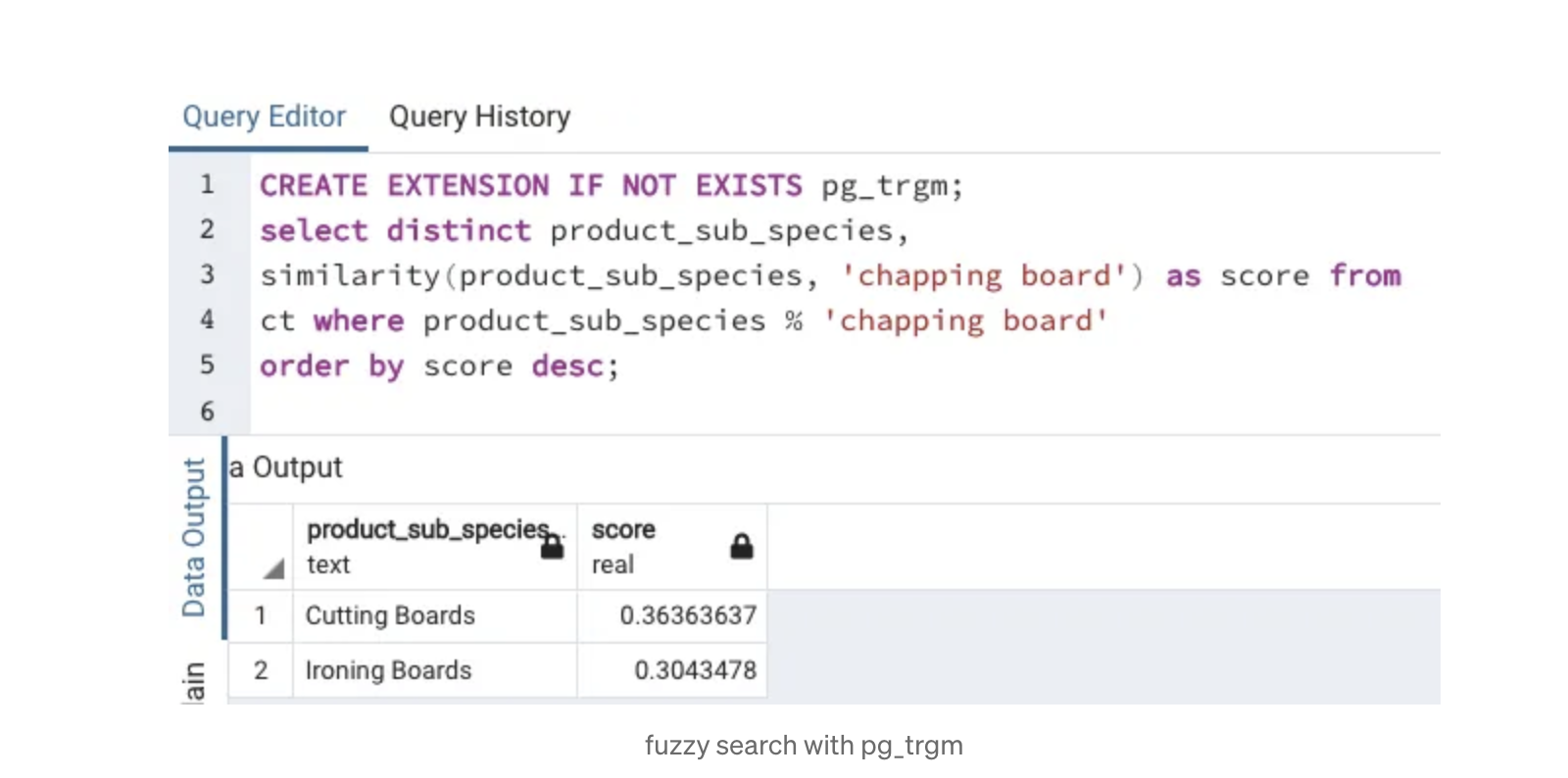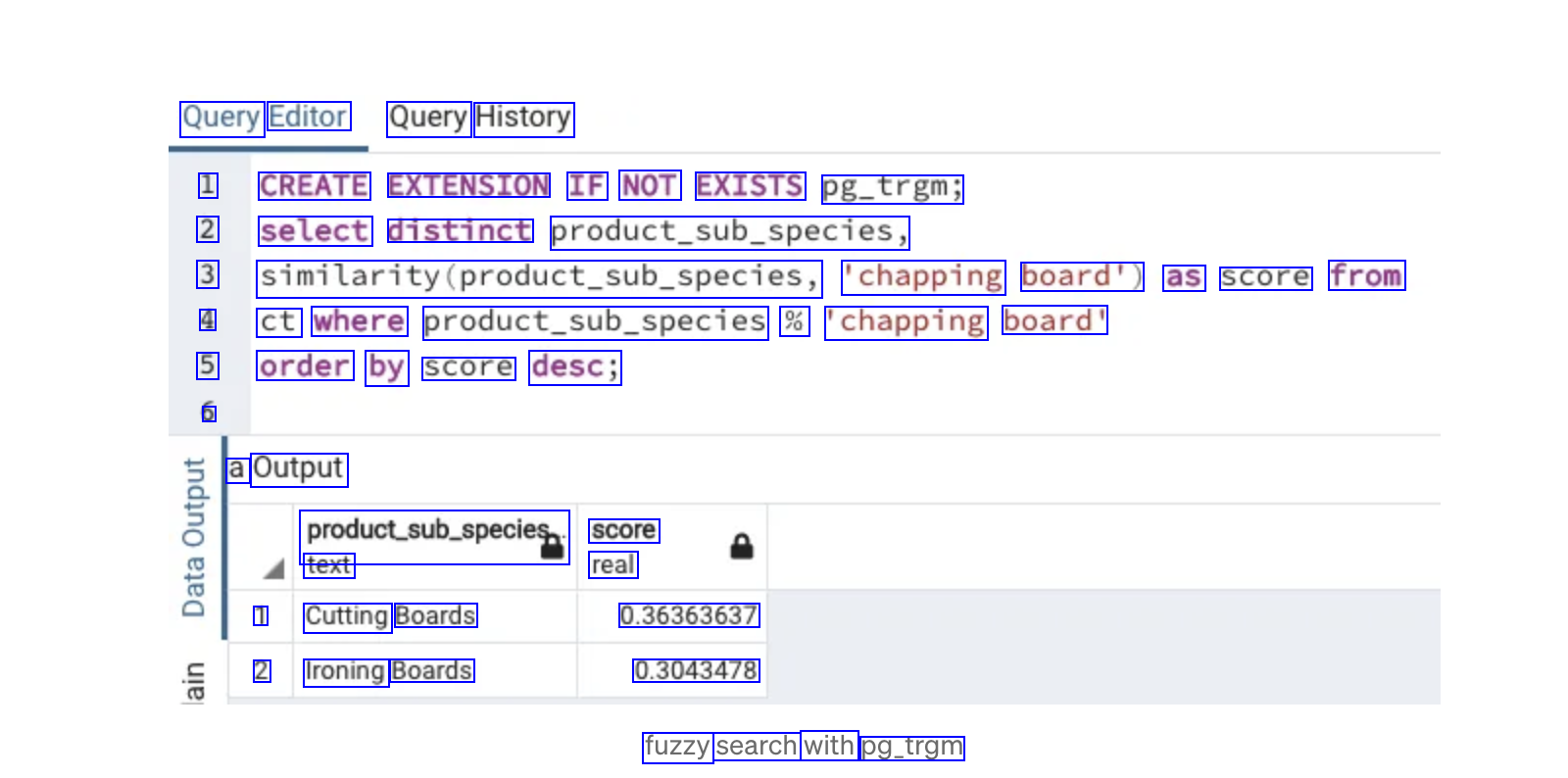 Query Editor Query History 1 CREATE EXTENSION IF NOT EXISTS pg_trgm; 2 select distinct product.sub.species, 3 similarity(product.sub.species, 'chapping board') as score from 4 ct where product.sub.species % 'chapping board' 5 order by score desc; b a Output productL.sub.species, score text real 1 Cutting Boards 0.36363637 2 Ironing Boards 0.3043478 fuzzy search with pg_trgm