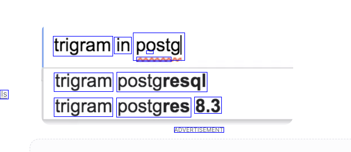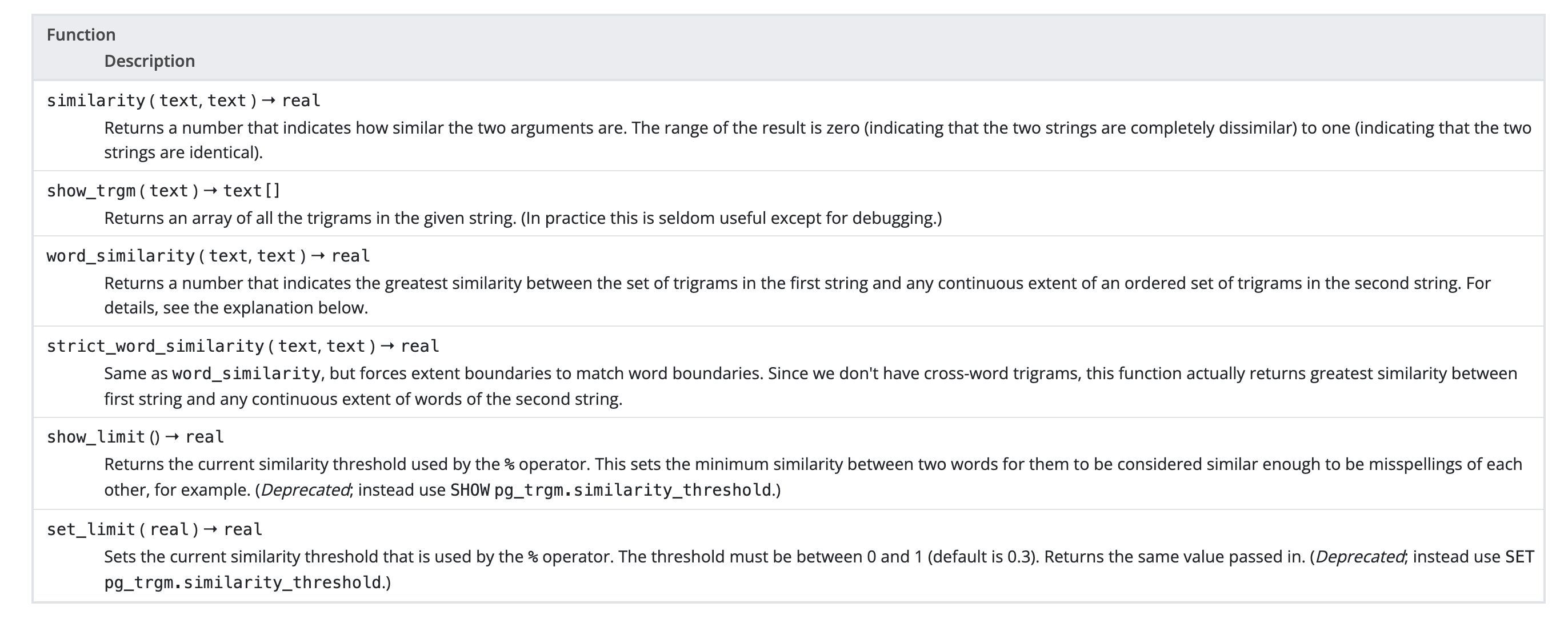 - The pg_trgm module from Postgres searches for similar strings based on trigram matching.