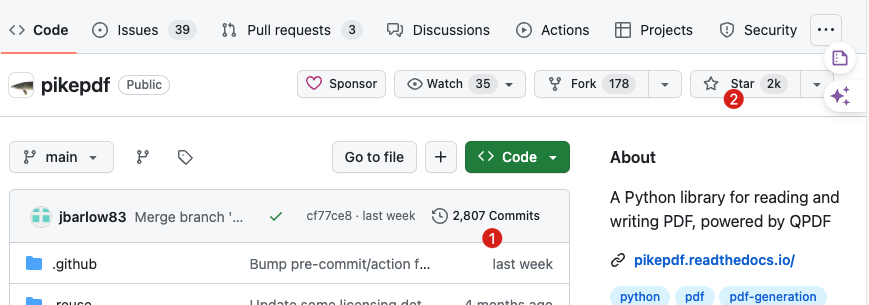 <> Code Issues 39 e1 Pull requests 3 Discussions Actions Projects Security pikepdf Public Sponsor Watch 35 V e Fork 178 . Star 2k 8 main V 8 S Go to file + <> Code V About A Python library for reading and jbarlow83 Merge branch I : cf77ce8 last week 2,807 Commits writing PDF, powered by QPDF .github Bump pre-commit/action f... last week e pikepdf.readthedocs.Io) python pdf pdf-generation
