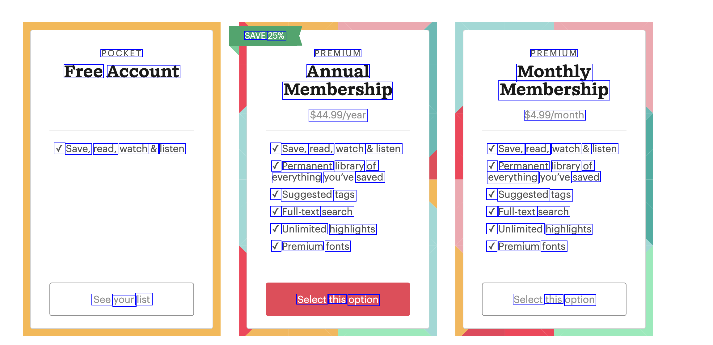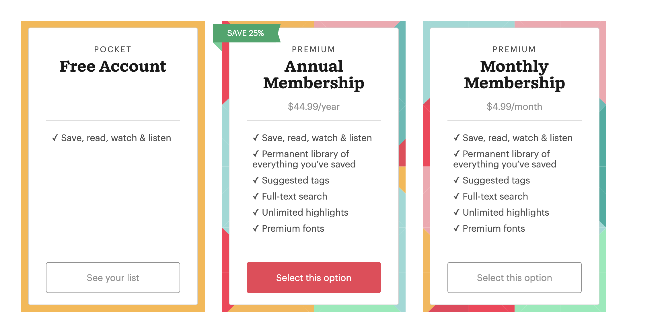 SAVE 25% POCKET Free Account PREMIUM Annual Membership PREMIUM Monthly Membership $44.99/year $4.99/month V Save, read, watch & listen V Save, read, watch & listen V Permanent library of everything you've saved V Suggested tags V Full-text search V Unlimited highlights V Premium fonts V Save, read, watch & listen V Permanent library of everything you've saved V Suggested tags V Full-text search V Unlimited highlights V Premium fonts See your list Select this option Select this option