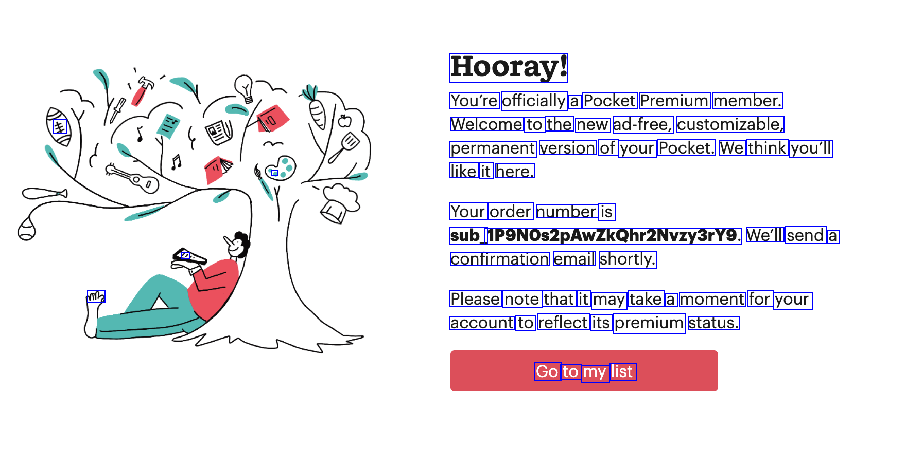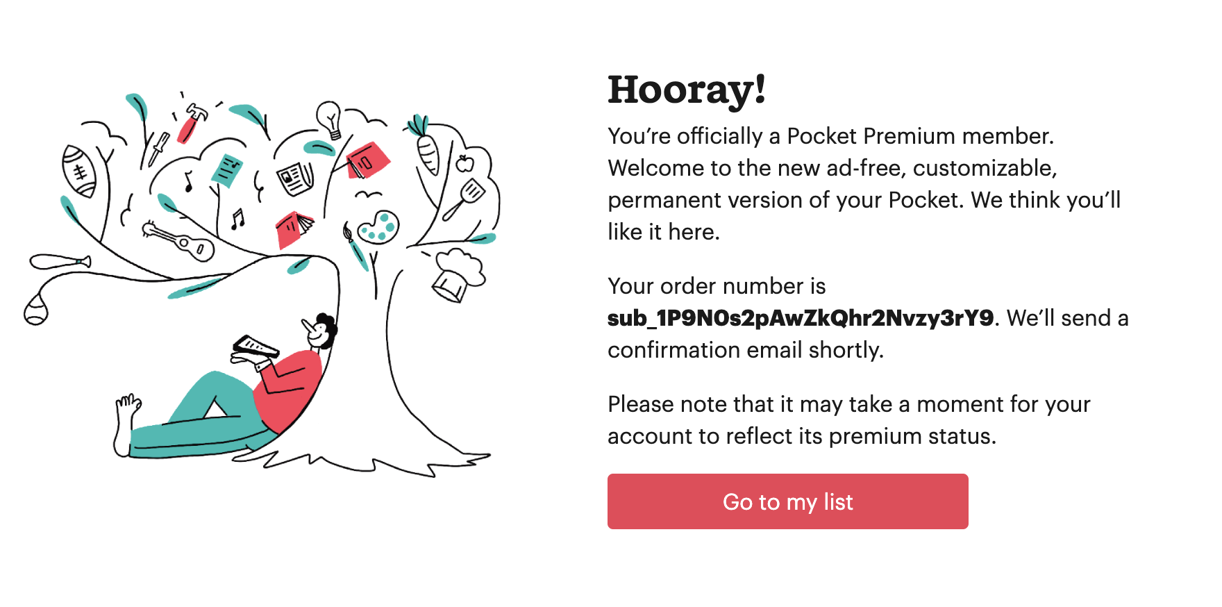 Hooray! You're officially a Pocket Premium member. Welcome to the new ad-free, customizable, permanent version of your Pocket. We think you'll * a like it here. Your order number is sub_ 1P9NOs2pAwZKQhr2Nvzy3rY9. We'll send a d confirmation email shortly. h Please note that it may take a moment for your account to reflect its premium status. Go to my list