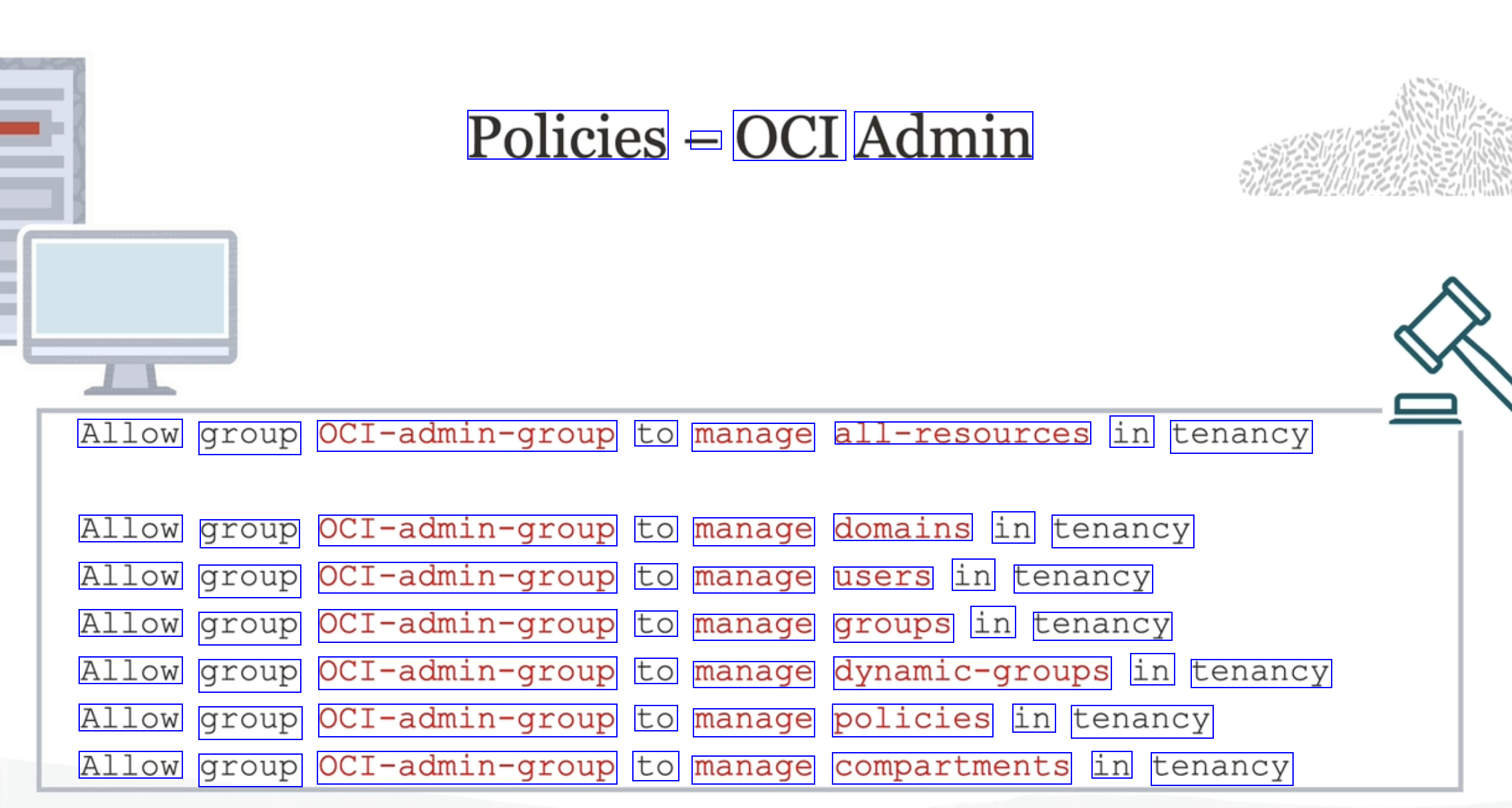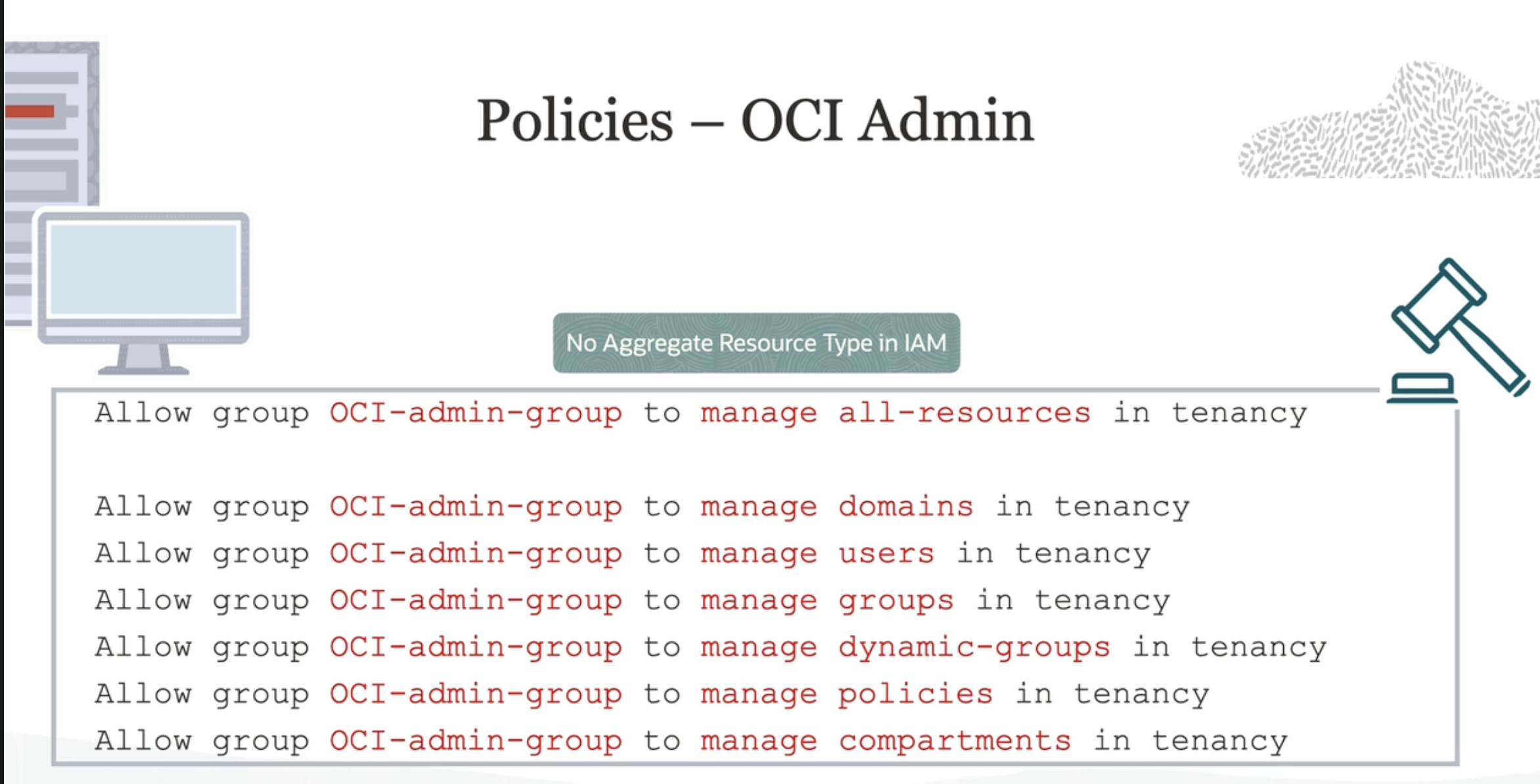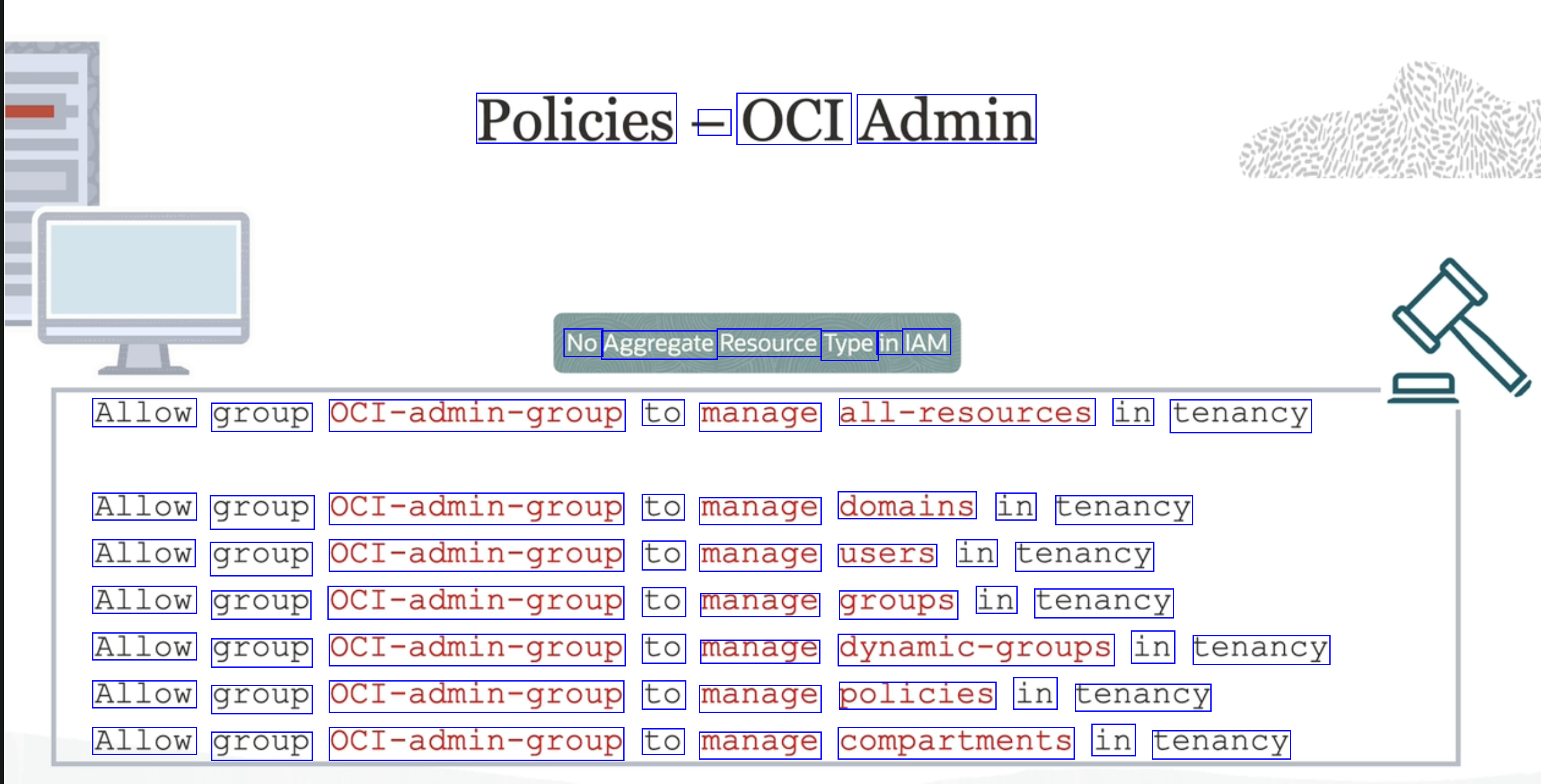 Policies - OCI Admin No Aggregate Resource Type in IAM Allow group OCI-admin-group to manage all-resources in tenancy Allow group OCI-admin-group to manage domains in tenancy Allow group OCI-admin-group to manage users in tenancy Allow group OCI-admin-group to manage groups in tenancy Allow group OCI-admin-group to manage dynamic-groups in tenancy Allow group OCI-admin-group to manage policies in tenancy Allow group OCI-admin-group to manage compartments in tenancy
