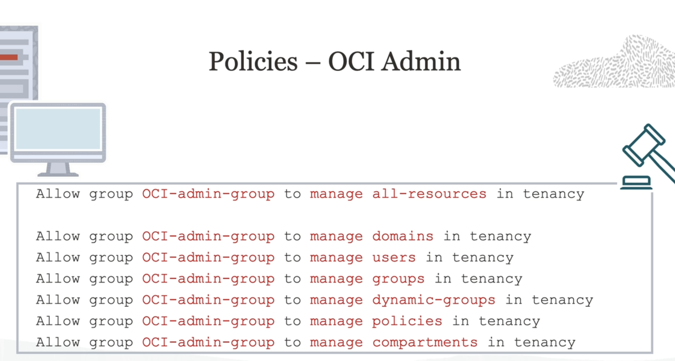 Policies - OCI Admin Allow group OCI-admin-group to manage all-resources in tenancy Allow group OCI-admin-group to manage domains in tenancy Allow group OCI-admin-group to manage users in tenancy Allow group OCI-admin-group to manage groups in tenancy Allow group OCI-admin-group to manage dynamic-groups in tenancy Allow group OCI-admin-group to manage policies in tenancy Allow group OCI-admin-group to manage compartments in tenancy