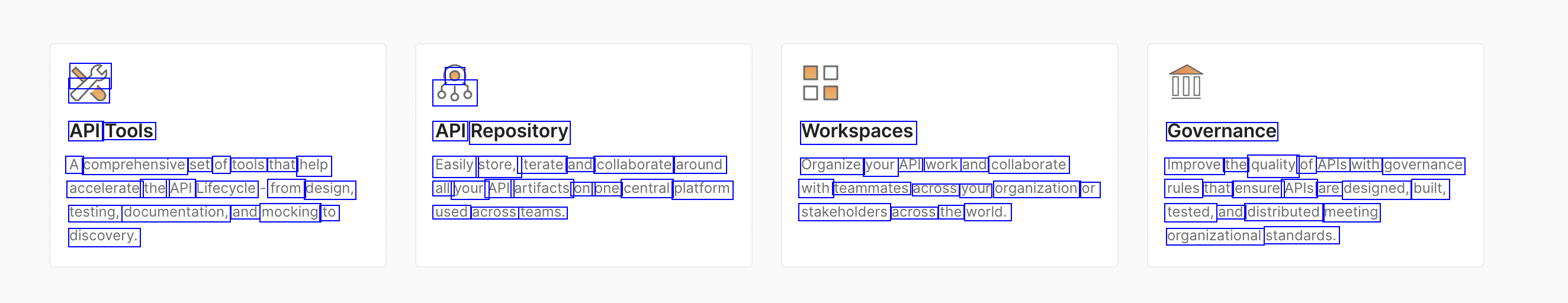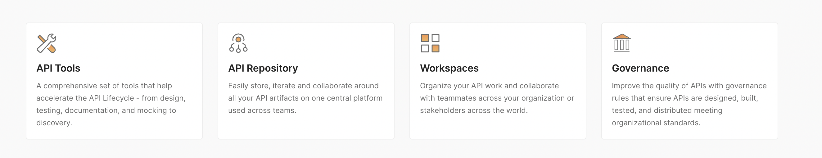 Y 6S O 680 API Tools API Repository Workspaces Governance A comprehensive set of tools that help Easily store, iterate and collaborate around Organize your API work and collaborate Improve the quality of APIs with governance accelerate the API Lifecycle from design, all your API artifacts on one central platform with teammates across your organization or rules that ensure APls are designed, built, testing, documentation, and mocking to used across teams. stakeholders across the world. tested, and distributed meeting discovery. organizational standards.