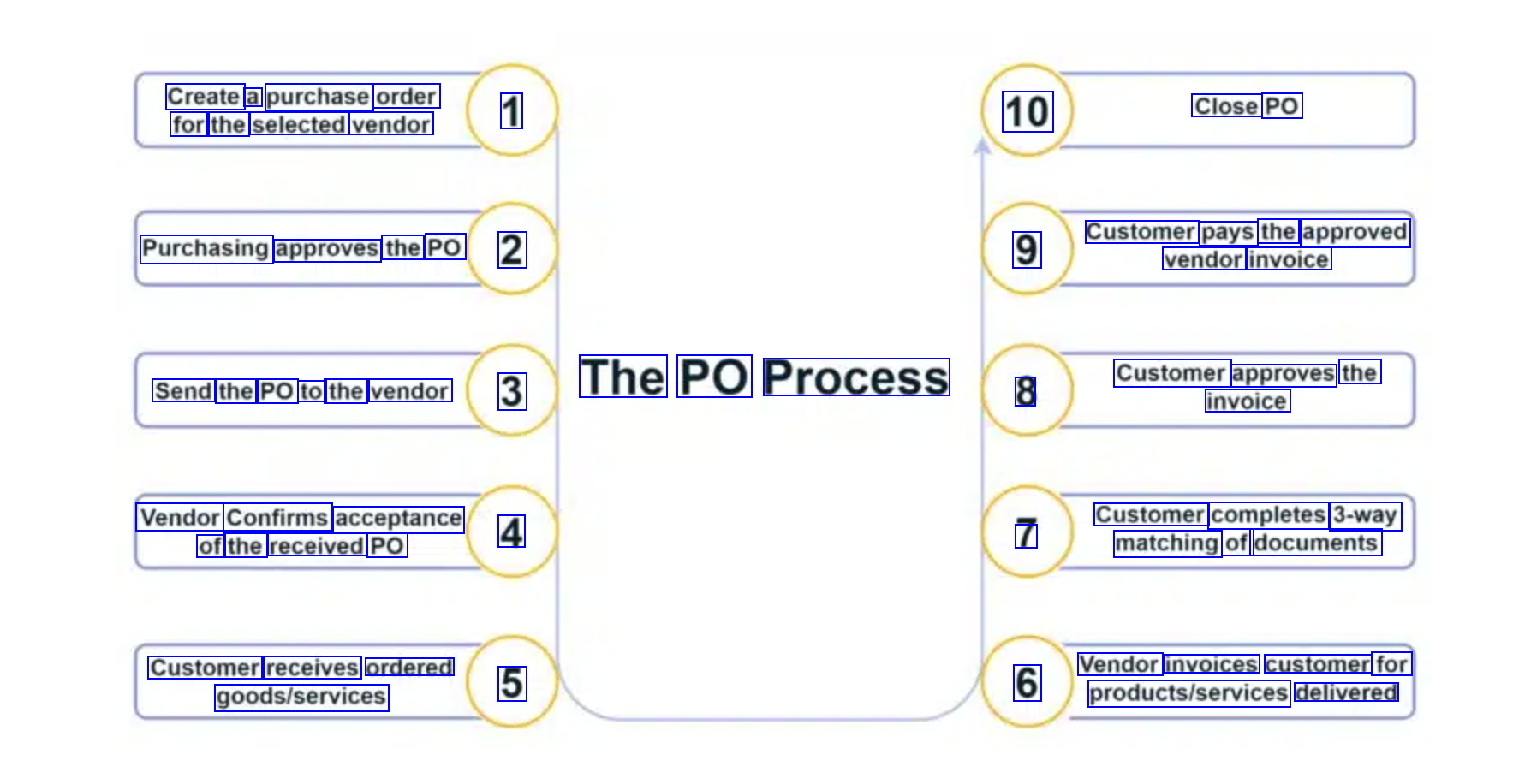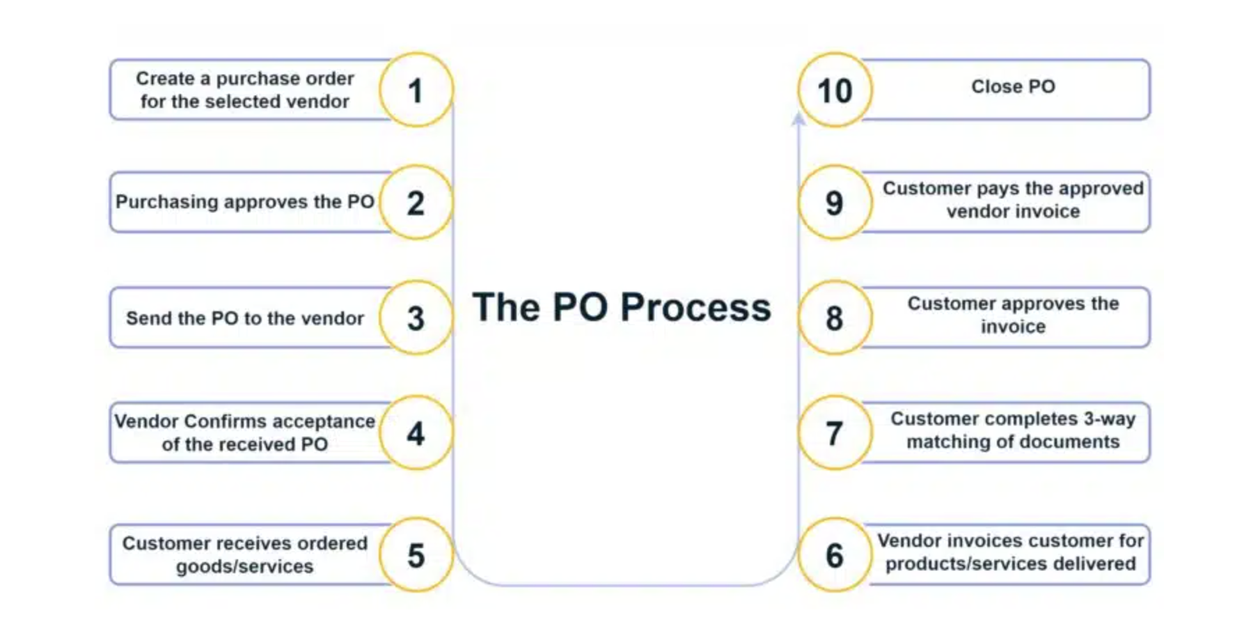 - Purchase order items, quantity, and prices (and receiving information) are matched with an invoice by the customer to ensure that the items have been ordered and billing is correct before paying the vendor.
