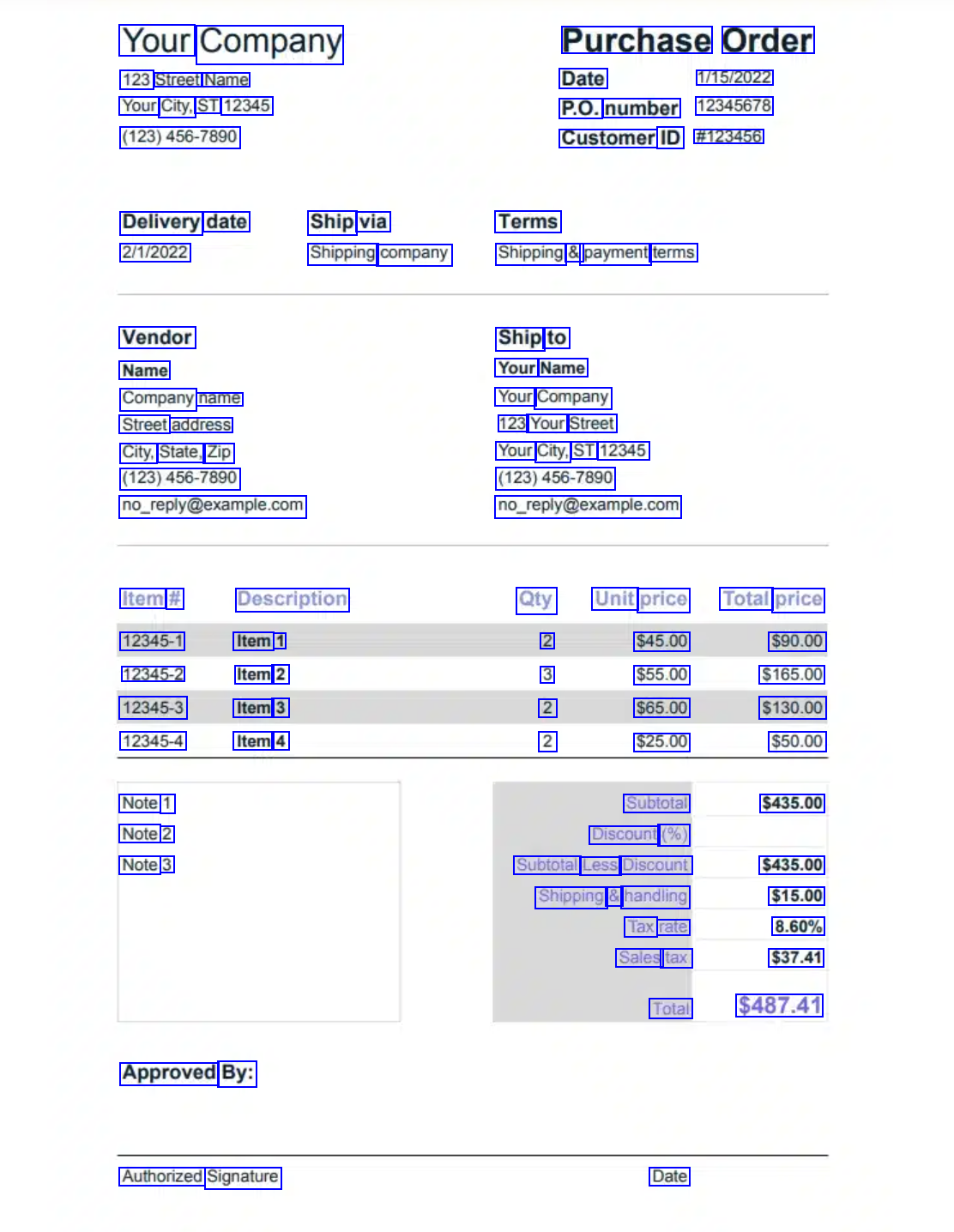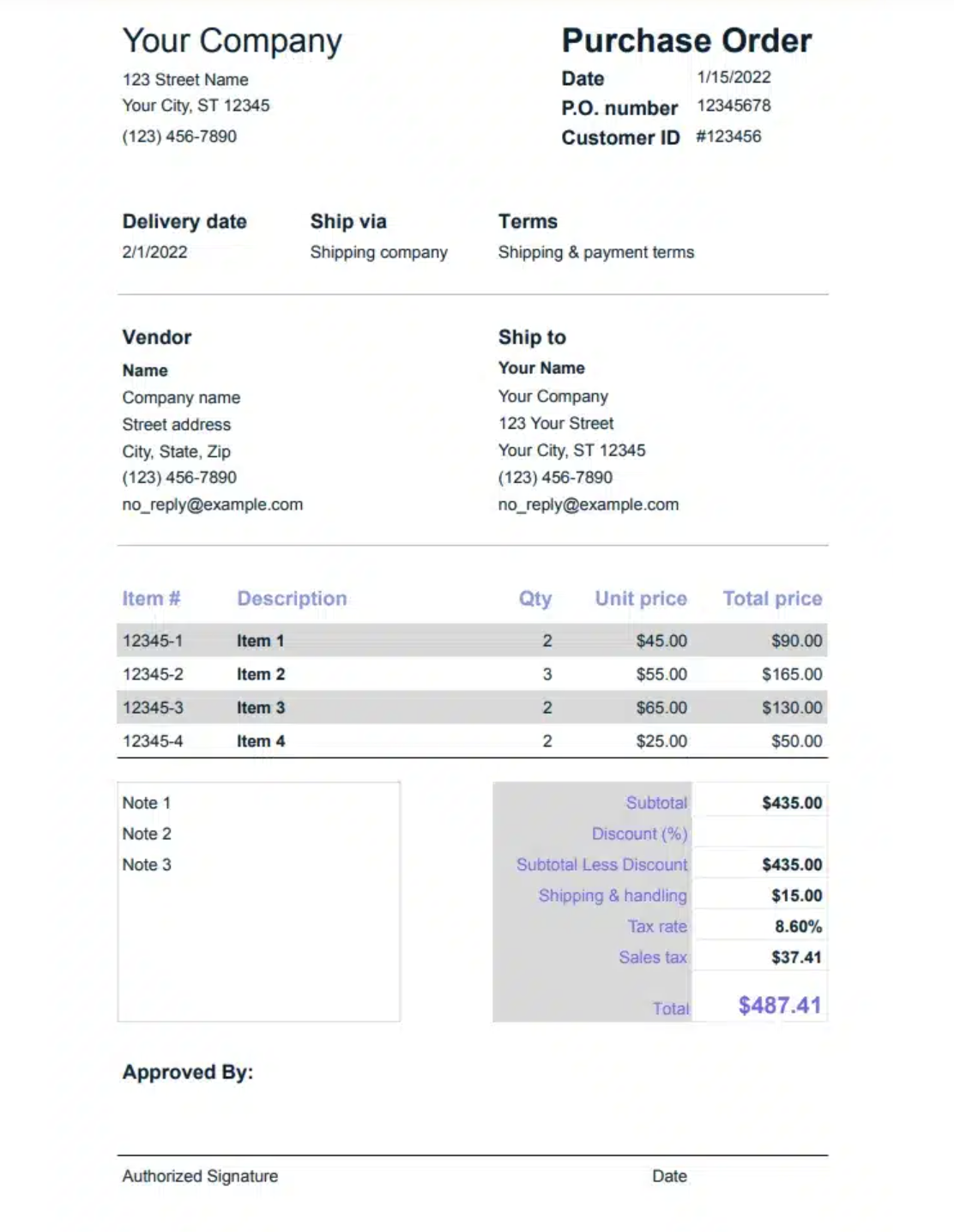 Your Company 123 Street Name Your City, ST 12345 (123)456-7890 Purchase Order P.O. number 12345678 Customer ID #123456 Date 1/15/2022 Delivery date 2/1/2022 Ship via Shipping company Terms Shipping & payment terms Vendor Name Company name Street address City, State, Zip (123)456-7890 no.Teply@example.com Ship to Your Name Your Company 123 Your Street Your City, ST 12345 (123)456-7890 no.Teply@example.com Item # 12345-1 12345-2 12345-3 12345-4 Note 1 Note 2 Note 3 Description Item 1 Item 2 Item 3 Item 4 Qty 2 3 2 2 Unit price Total price $45.00 $55.00 $65.00 $25.00 Subtotal Discount (%) Subtotal Less Discount Shipping & handling $90.00 $165.00 $130.00 $50.00 $435.00 $435.00 $15.00 8.60% $37.41 $487.41 Tax rate Sales taxi Total Approved By: Authorized Signature Date
