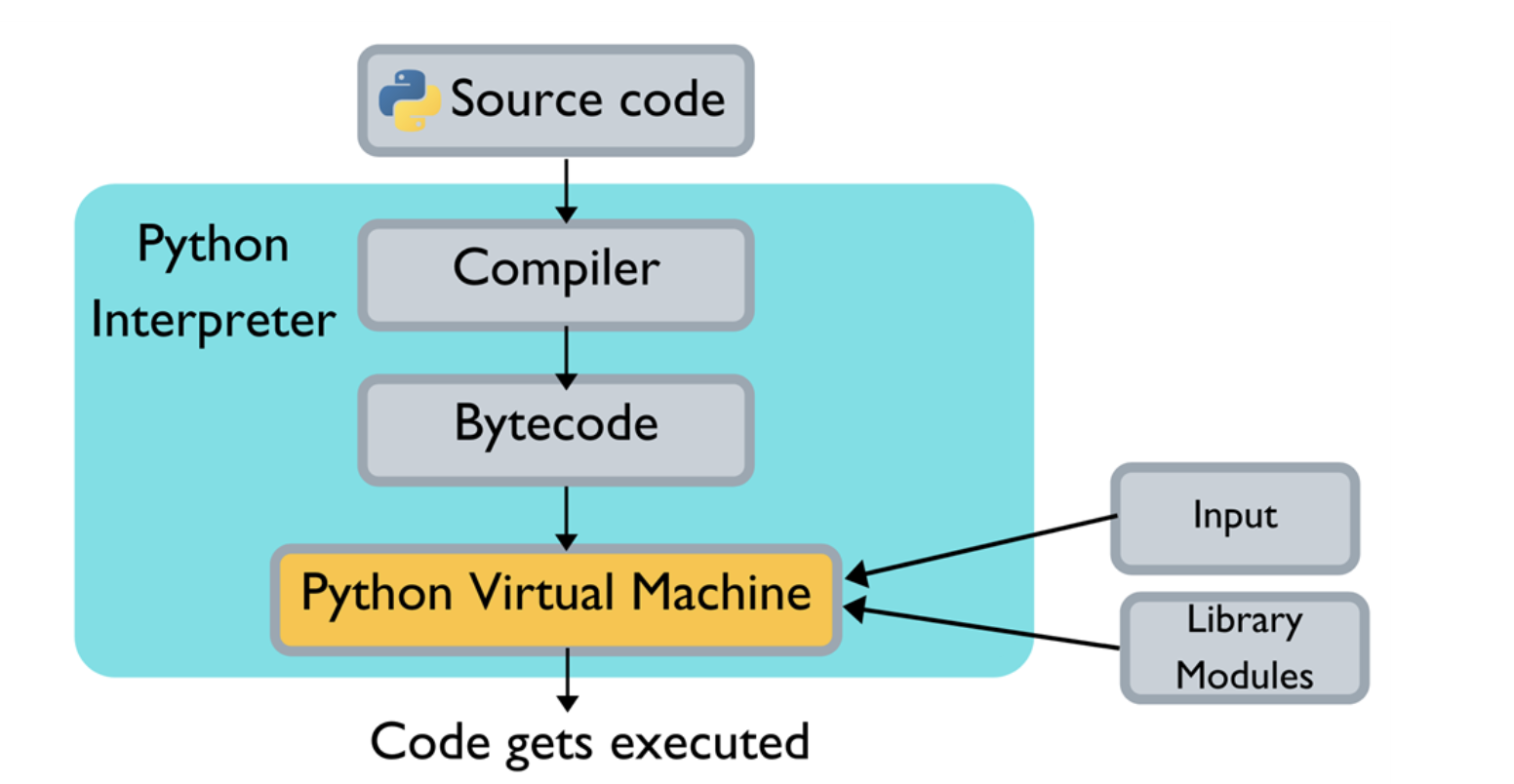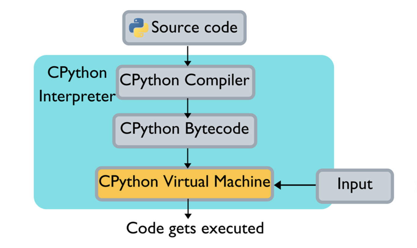 - CPython compiles your Python code into (transparently) and interprets that bytecode in a evaluation loop.