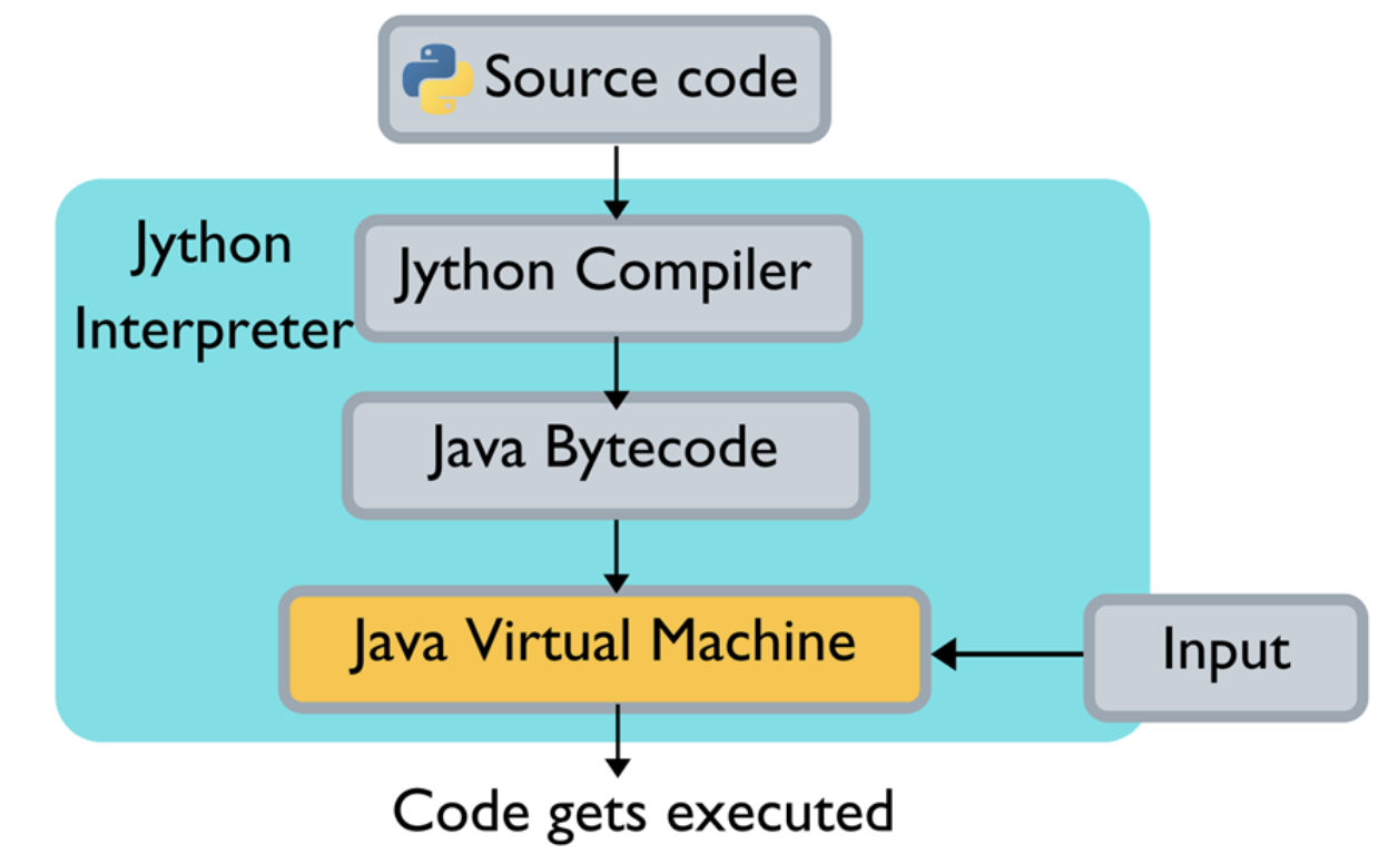 Jython is the java implementation of Python where it compiles the Python code into Java Bytecode. The Java Bytecode is executed by the Java Virtual Machine (JVM).