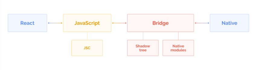 The core element of React Native architecture is the Bridge. This system employs React library to render the application on a device. Simply put, the bridge transforms the JS code into the native components and vice versa. The bridge translates JavaScript into platform-specific components. It gets the JS call, leverages the APIs (Kotlin, Objective C, Java), which allows native rendering of an application. The process doesn’t affect user experience because these async calls take place apart from the main thread.