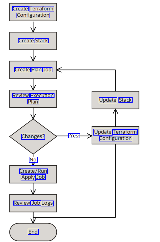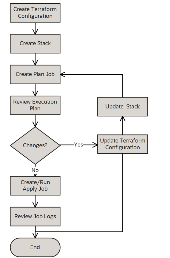 Create Terraform Configuration Create Stack Create Plan Job Review Execution Plan Update Stack Update Terraform Configuration Changes? Yes- No V Create/Run Apply Job Review Job Logs End