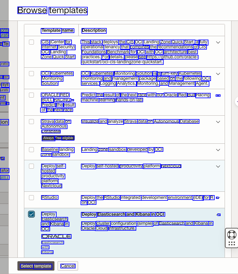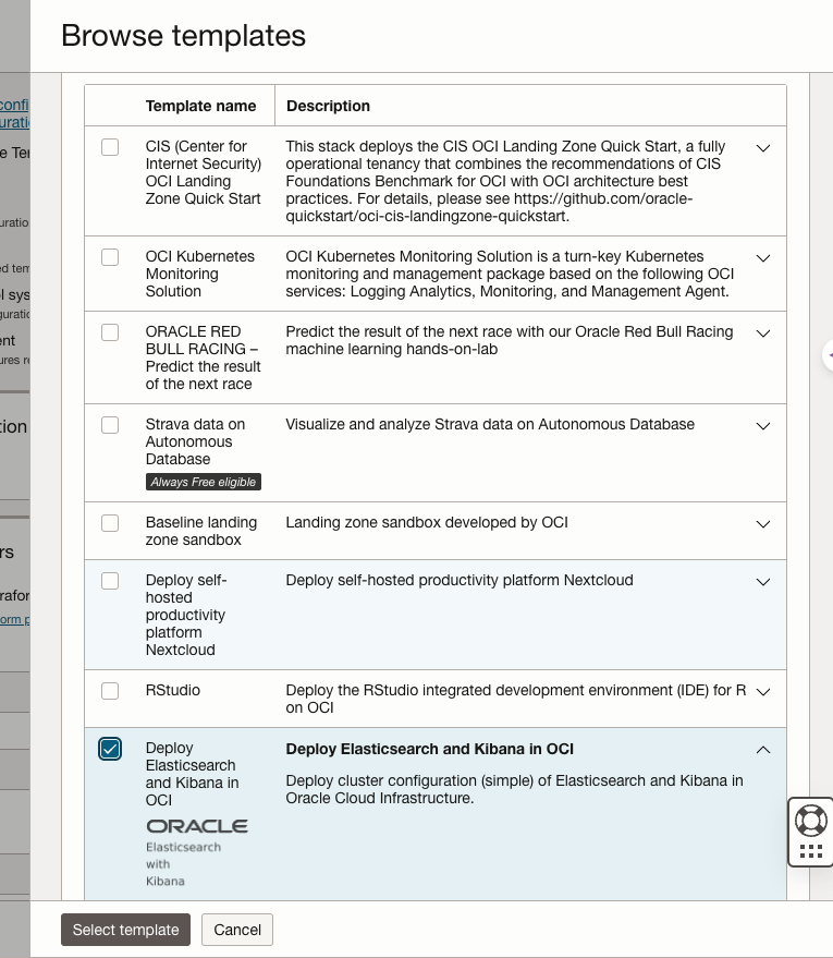 Browse templates onn prati e Tei Template name Description CIS (Center for OCI Landing This stack the CIS OCI Zone Quick deploys Landing Start, a fully Internet Security) operational tenancy that combines the recommendations of CIS Zone Quick Start practices. For details, please see nttps./github.com/oracle- OCI Kubernetes OCI Kubernetes Monitoring Solution is a turn-key Kubernetes Foundations Benchmark for OCI with OCI architecture best uratio d ter sys uratic nt ures n quckstart/oc-dls-landingzone-quickstat. Monitoring Solution ORACLE RED Predict the result of the next race Strava data on Autonomous Database Always Free eligible zone sandbox Deploy self- hosted productivity platform Nextcloud RStudio Deploy Elasticsearch and Kibana in OCI ORACLE Elasticsearch with Kibana monitoring and management package based on the following OCI services: Logging Analytics, Monitoring, and Management Agent. Predict the result of the next race with our Oracle Red Bull Racing - BULL RACING - machine learning hands-on-lab ion Visualize and analyze Strava data on Autonomous Database Baseline landing Landing zone sandbox developed by OCI S rafor ormp Deploy self-hosted proauctivity platform Nextcloud Deploy the RStudio integrated development environment (IDE) for R 2 on OCI Deploy Elasticsearch and Kibana in OCI - Deploy cluster configuration (simple) of Elasticsearch and Kibana in Oracle Cloud Infrastructure. Select template Cancel