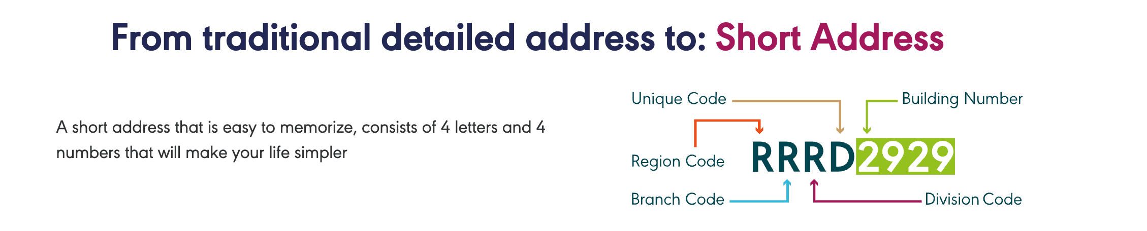 Short address can be represented with 8 letters and can be expanded into full address inside Saudi Arabia