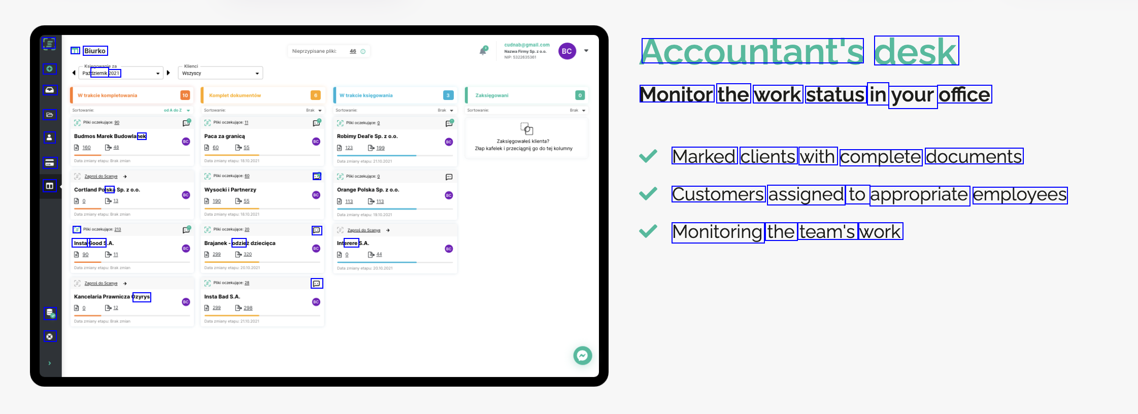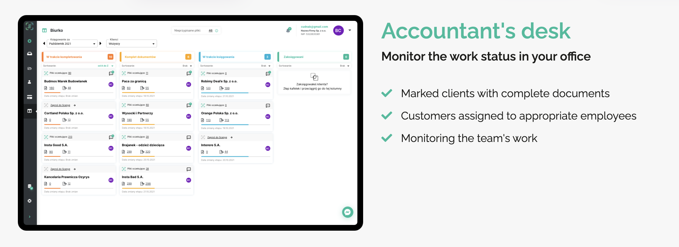 LE E Biurko o izlernik 2021 a e : lE m ska Accountant's desk Monitor the work status in your office nek Marked clients with complete documents E Customers assigned to appropriate employees C Insta Goods a erere Monitoring the team's work odzie D zyrys E o