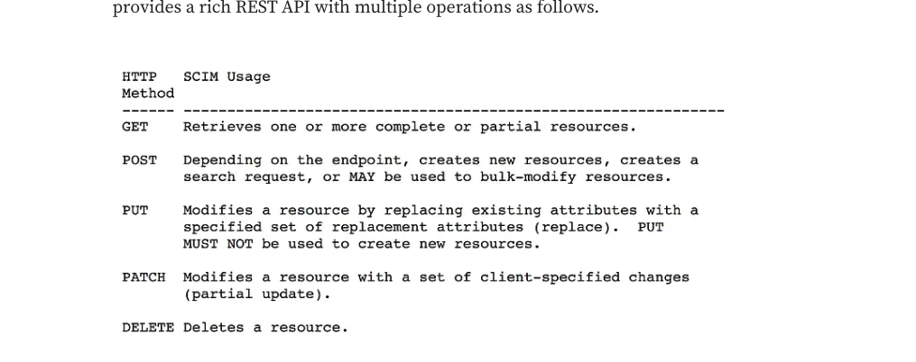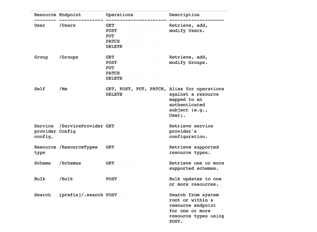 The SCIM Protocol is an application-level, REST protocol for creation, modification, retrieval, and discovery of core identity resources. SCIM provides a rich REST API with multiple operations as follows.
