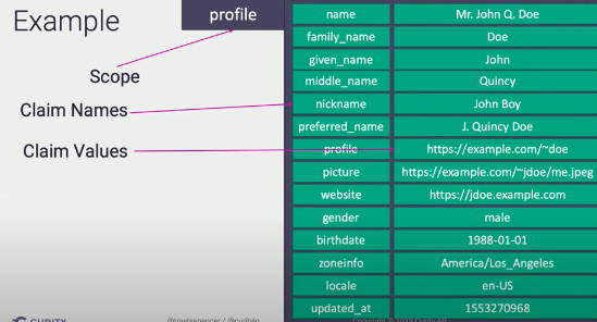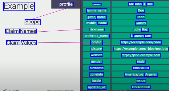 profile name Mr. John Q. Doe Example family_name Doe given, name John Scope middle name Quincy Claim Names nickname John Boy preferred_name J. Quincy Doe Claim Values profile tps/eampe.com/rdoe picture https//example.com/"idoe/mejpeg website ntps/1doe.campe.com gender male birthdate 1988-01-01 zoneinfo America/Los Angeles locale en-US updated_at 1553270968