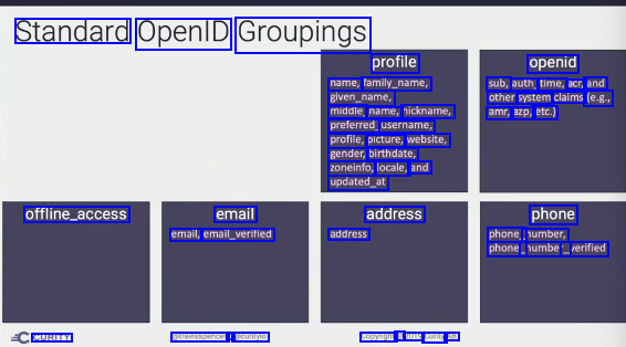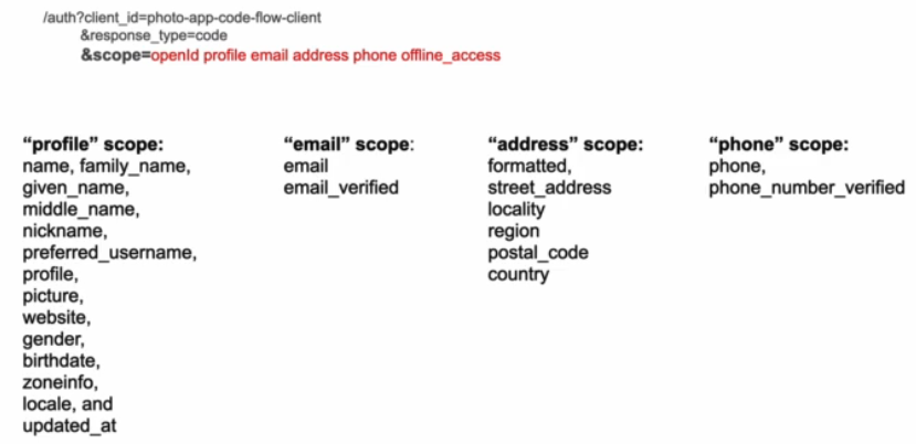 auth?client_ erphobappcodetowdent Gresponse_type-code &scope=openld profile email address phone offline_ access "profile" scope: name, family_ _name, given name, middle_ _name, nickname, "email" scope: email "address" scope: formatted, street address locality region postal code country "phone" scope: phone, email verified phone number_ verified preferred username, profile, picture, website, gender, birthdate, zoneinfo, locale, and updated _at