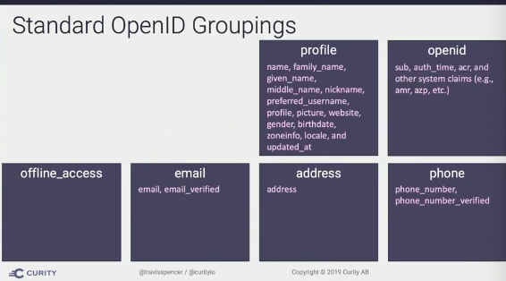 Standard OpenID Groupings profile openid name, tamily_name, given_name, sub, auth_ time, acr, and other system claims (e.g., amr, azp, etc.) middle_ name, nickname, preferred username, profile, picture, website, gender, birthdate, zoneinfo, locale, and updated_at offline_access email address phone email, email_verified address phone_ number, phone_ number_ _verified CURITY gtravisspencer / geurityio Copyright e 2019 Curity AB