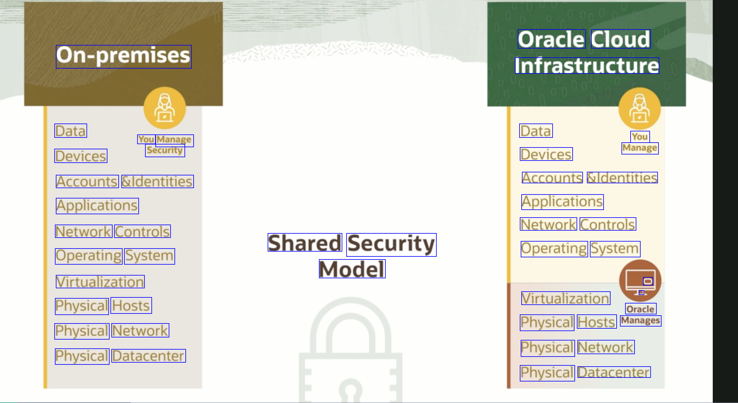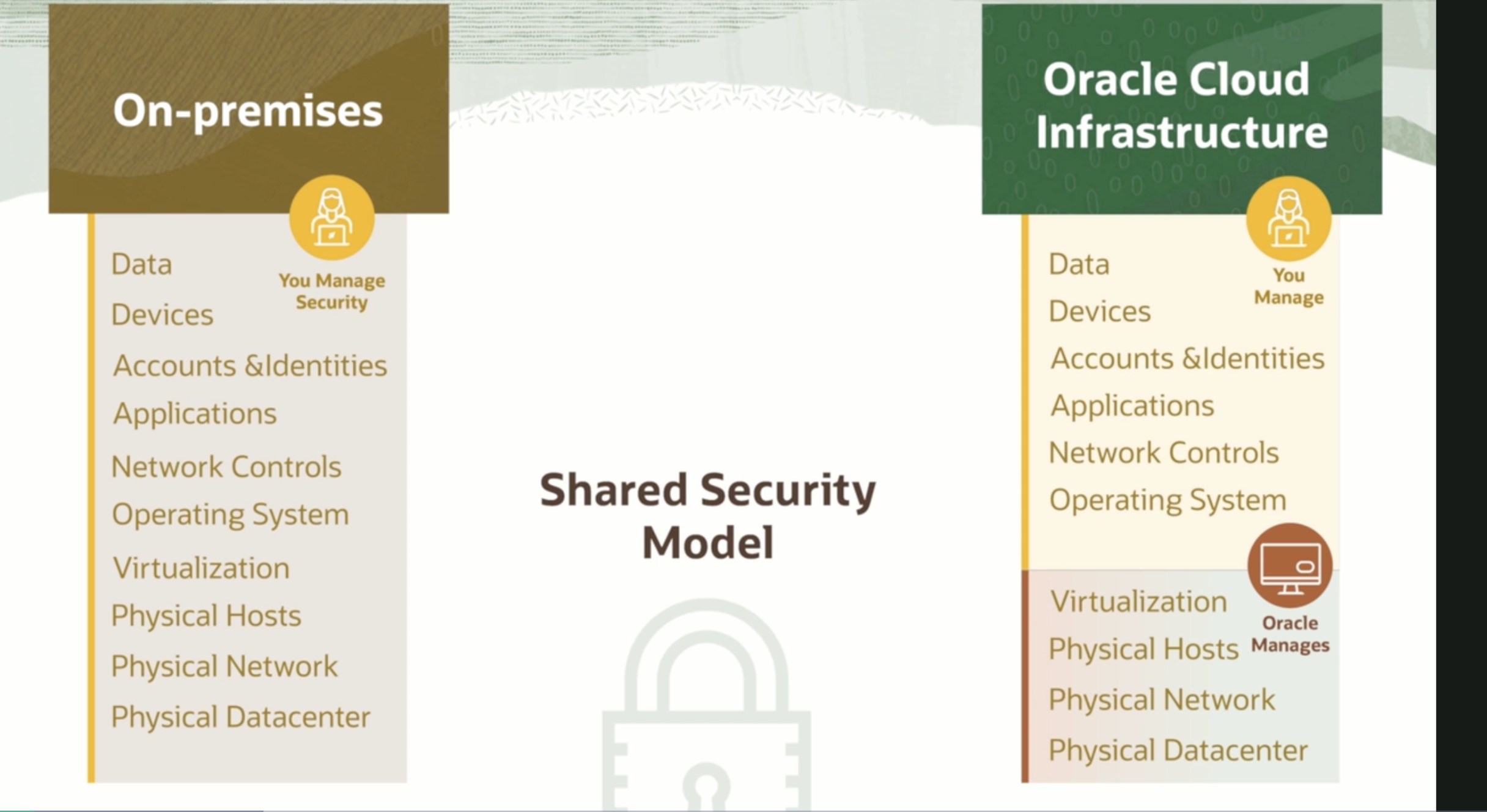 Oracle Cloud On-premises Infrastructure Data Data Devices You Manage Security You Manage Devices Accounts &ldentities Applications Accounts &ldentities Applications Network Controls Operating System Network Controls Operating System Virtualization Physical Hosts Shared Security Model O - Oracle Virtualization Physical Hosts Manages Physical Network Physical Network Physical Datacenter Physical Datacenter