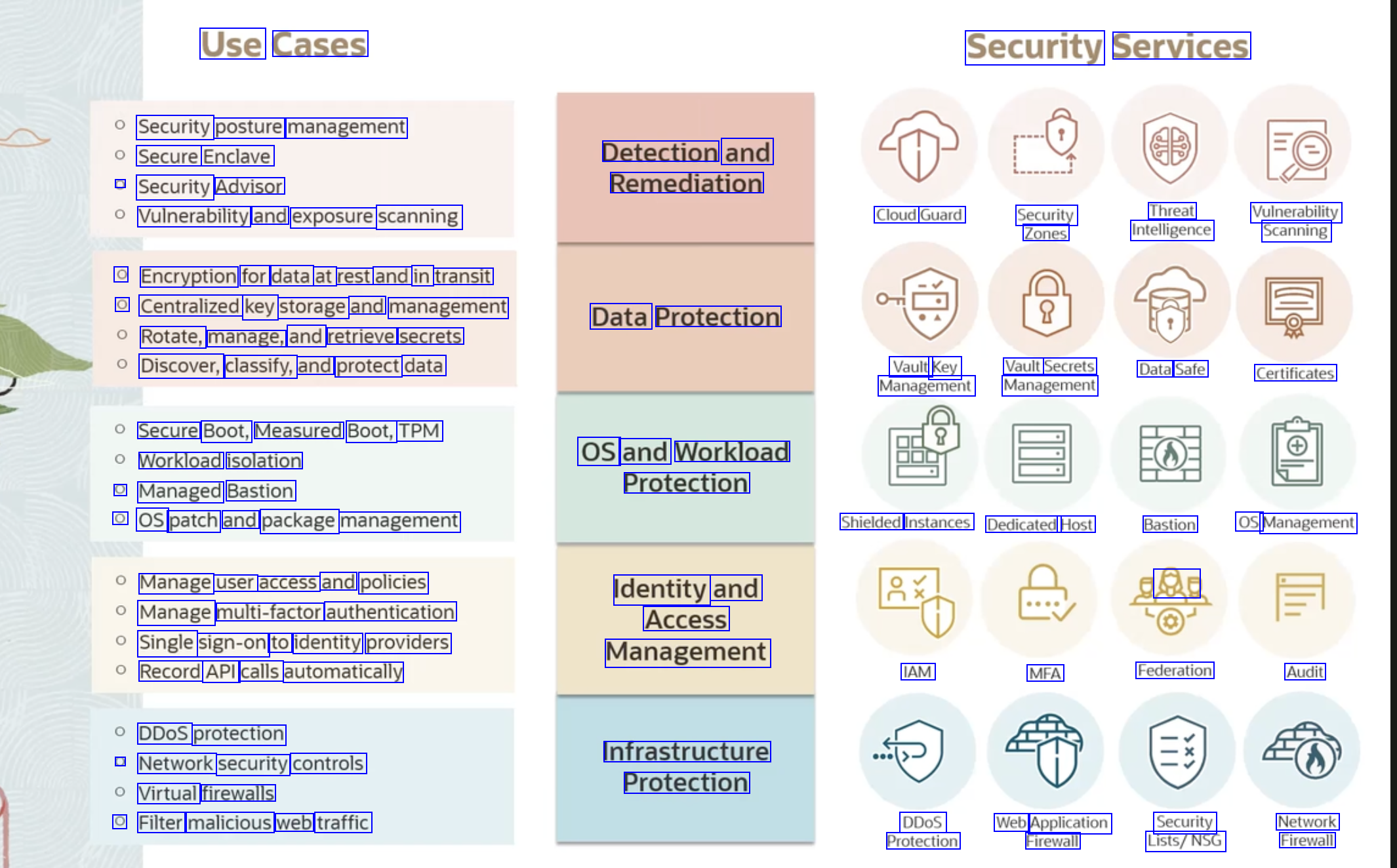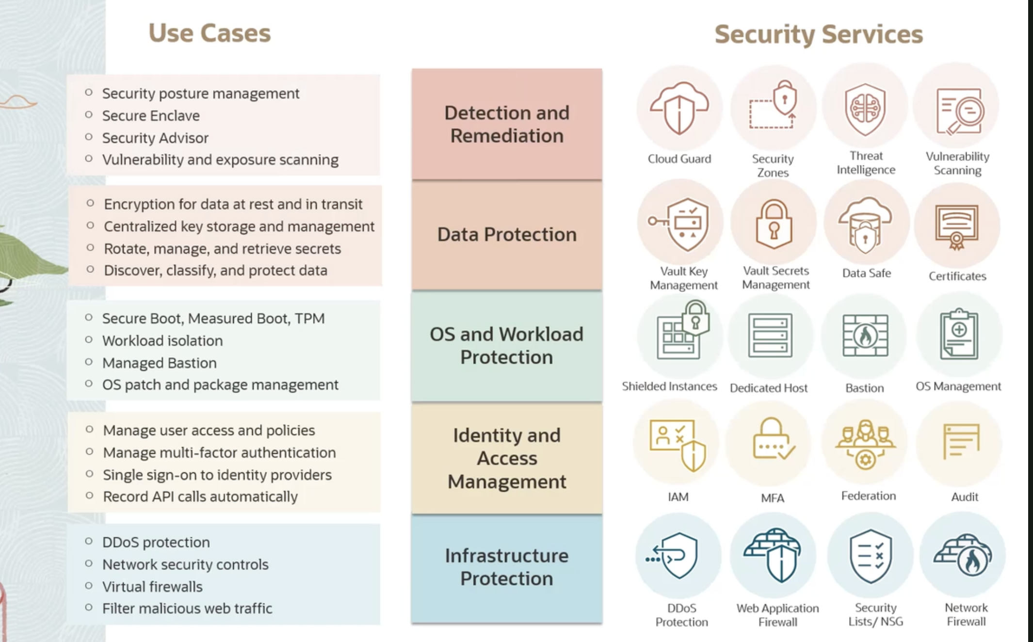 Use Cases Security Services Security posture management Secure Enclave O Security Advisor Detection and Remediation Vulnerability and exposure scanning Cloud Guard Security Zones Threat Intelligence Vulnerability Scanning O Encryption for data at rest and in transit O Centralized key storage and management Rotate, manage, and retrieve secrets Discover, classify, and protect data Data Protection Vault Key Vault Secrets Data Safe Certificates Management Management Secure Boot, Measured Boot, TPM Workload isolation o Managed Bastion OS and Workload Protection O OS patch and package management Shielded Instances Dedicated Host Bastion OS Management Manage user access and policies Manage multi-factor authentication Single sign-on to identity providers Record API calls automatically Identity and Access Management 88 IAM MFA Federation Audit DDOS protection o Network security controls Virtual firewalls O Filter malicious web traffic Infrastructure Protection DDOS Protection Web Application Security Firewall Network Firewall Lists/NSG