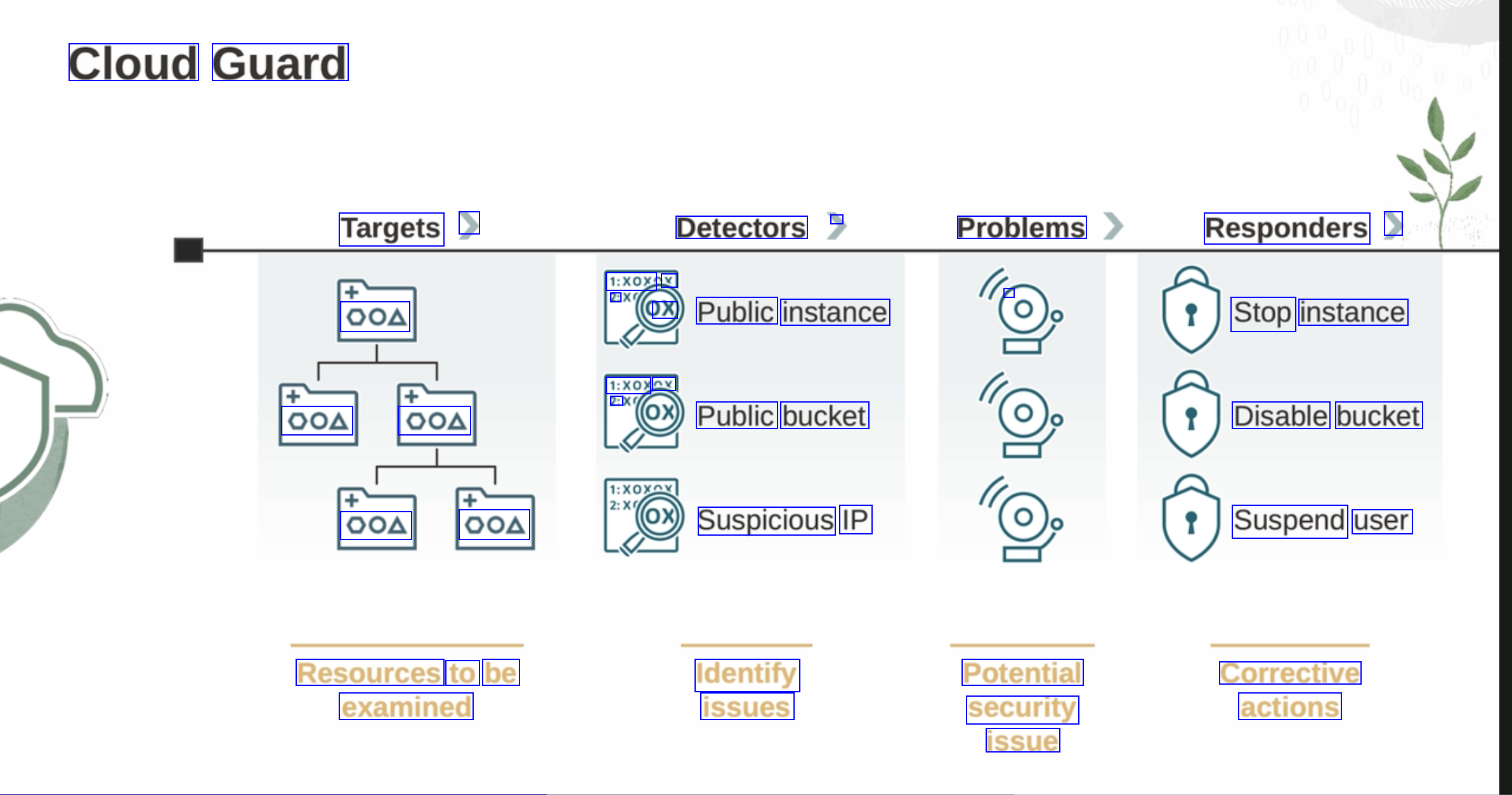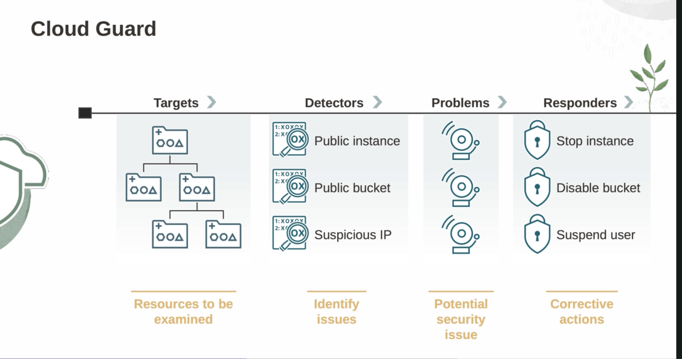 Cloud Guard Targets > Detectors - Problems Responders > 1:XOX 2: x - OOA OX Public instance Stop instance 1:XOX Ay 2: OOA OOA Public bucket Disable bucket OOA OOA Suspicious IP Suspend user Resources to be examined Identify issues Potential security issue Corrective actions