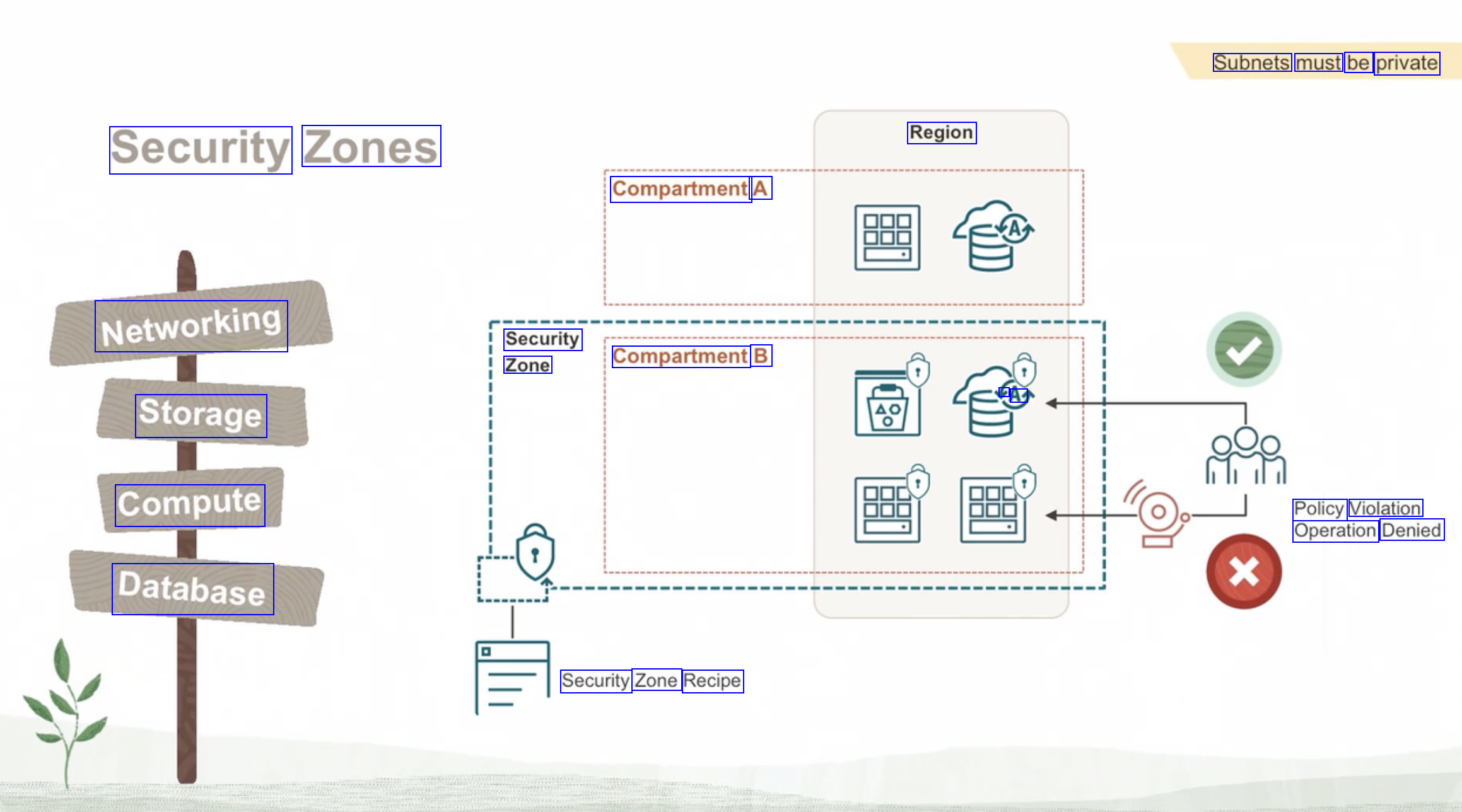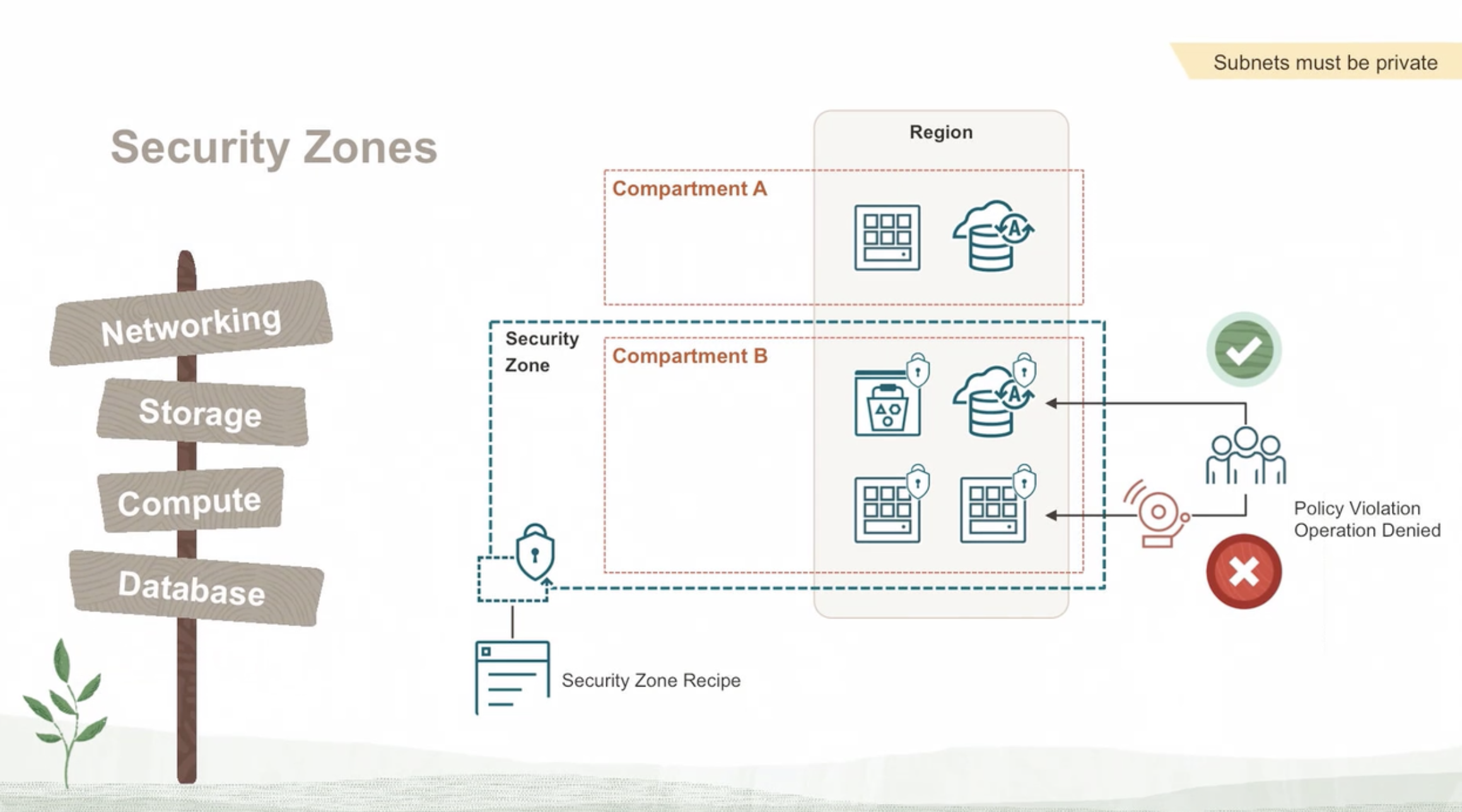 Subnets must be private Region Security Zones Compartment A Networking Security Zone Compartment B AY Storage Compute Policy Violation Operation Denied Database Security Zone Recipe