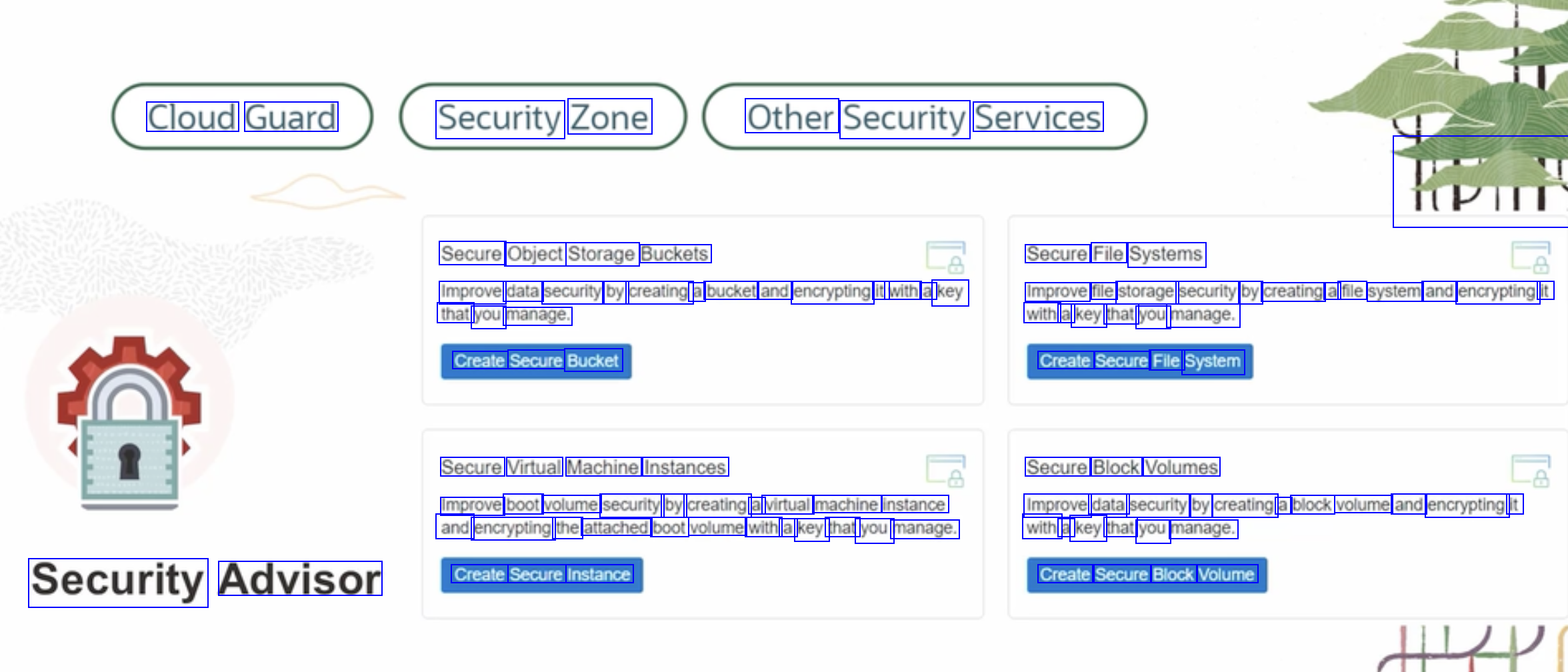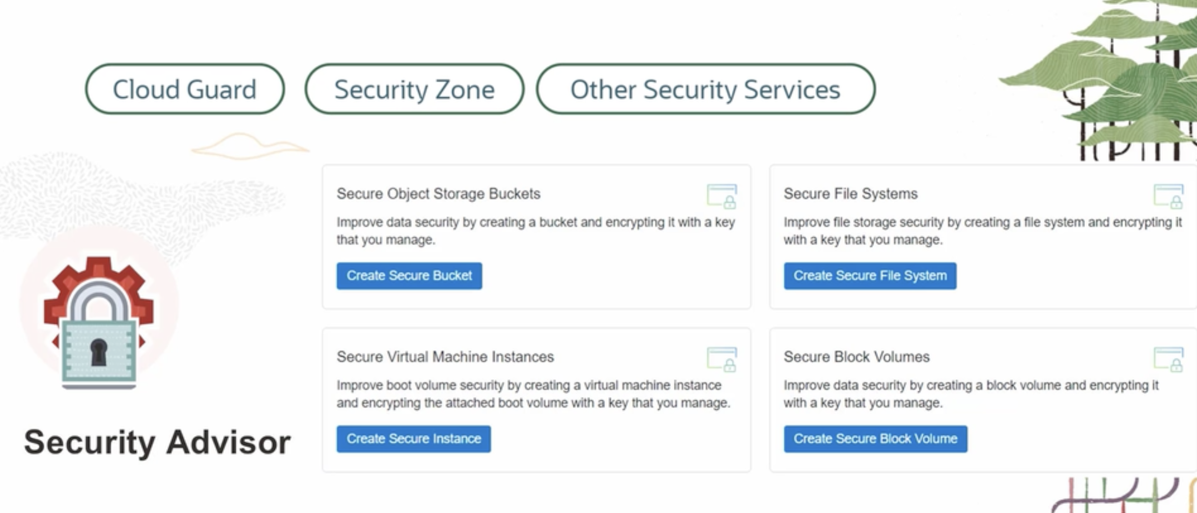 Cloud Guard Security Zone Other Security Services HPT Secure Object Storage Buckets Secure File Systems Improve data security by creating a bucket and encrypting it with a key Improve file storage security by creating a file system and encrypting it that you manage. with a key that you manage. Create Secure Bucket Create Secure File System Secure Virtual Machine Instances Secure Block Volumes Improve boot volume security by creating a virtual machine instance and encrypting the attached boot volume with a key that you manage. Improve data security by creating a block volume and encrypting it with a key that you manage. Security Advisor Create Secure Instance Create Secure Block Volume