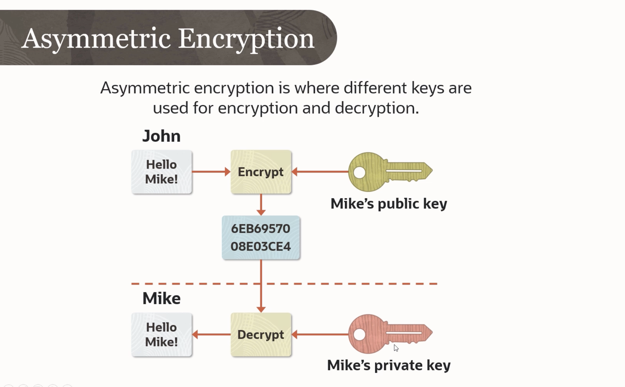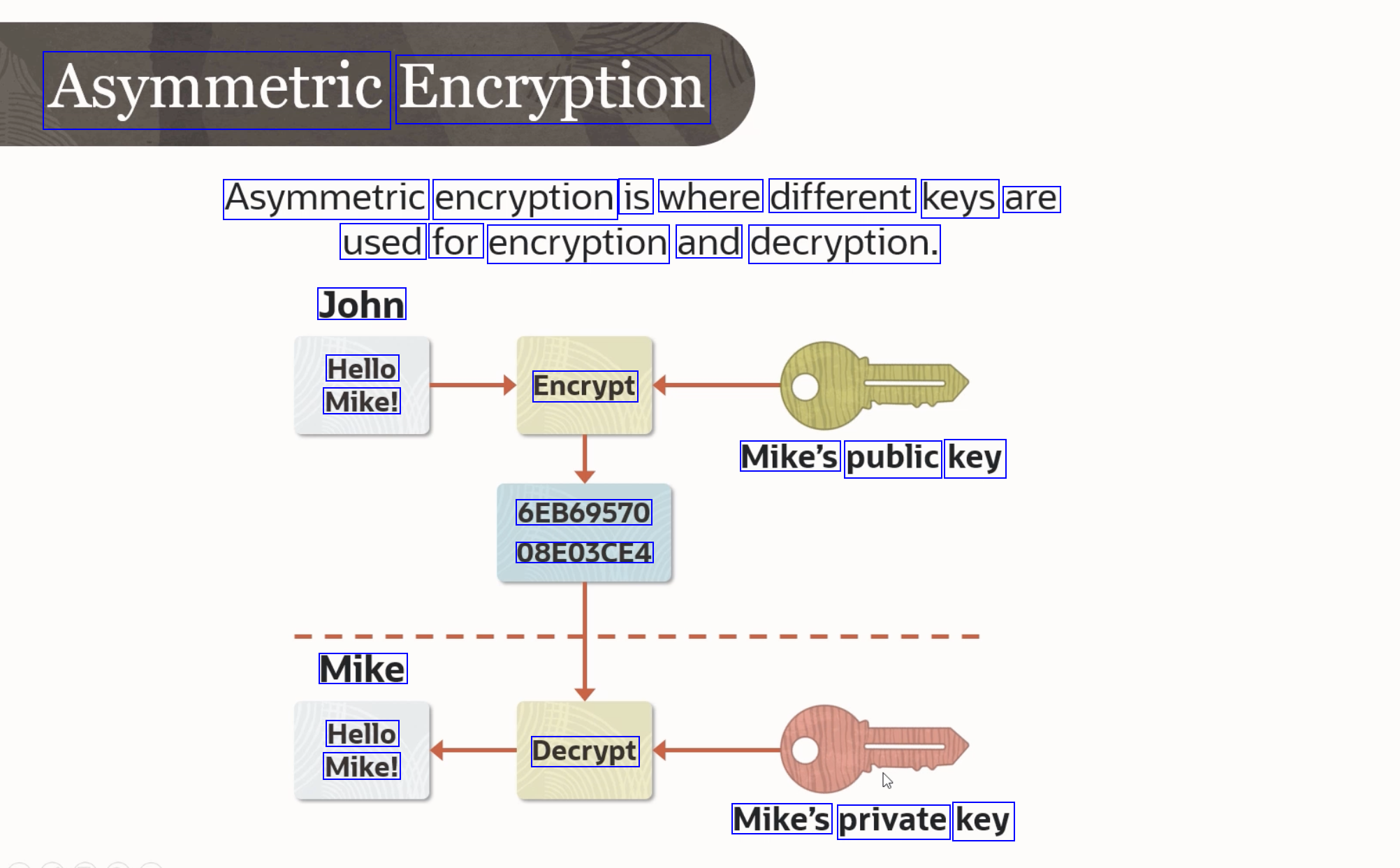 Asymmetric Encryption Asymmetric encryption is where different keys are used for encryption and decryption. John Hello Mike! Encrypt Mike's public key 6EB69570 08E03CE4 Mike Hello Mike! Decrypt Mike's private key