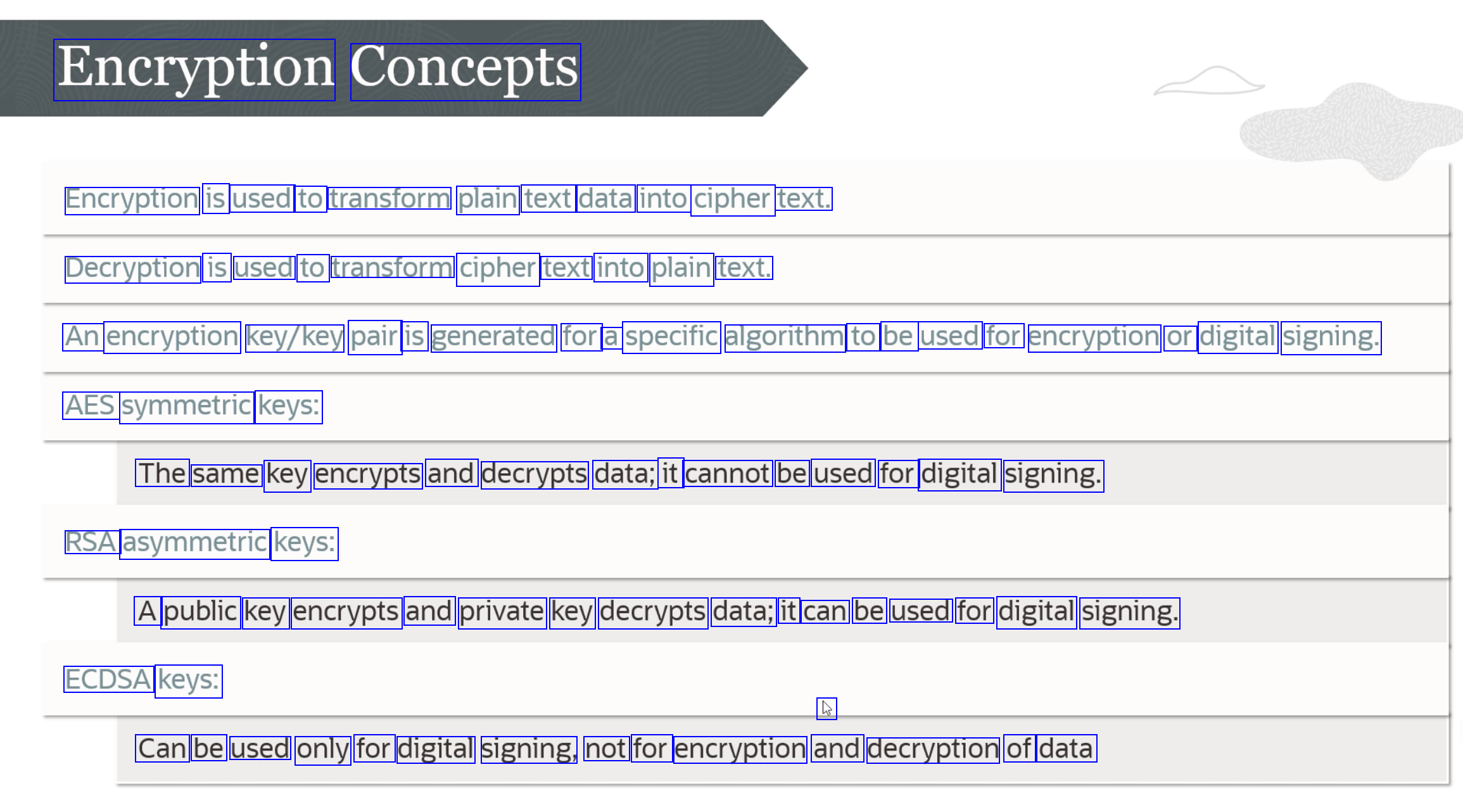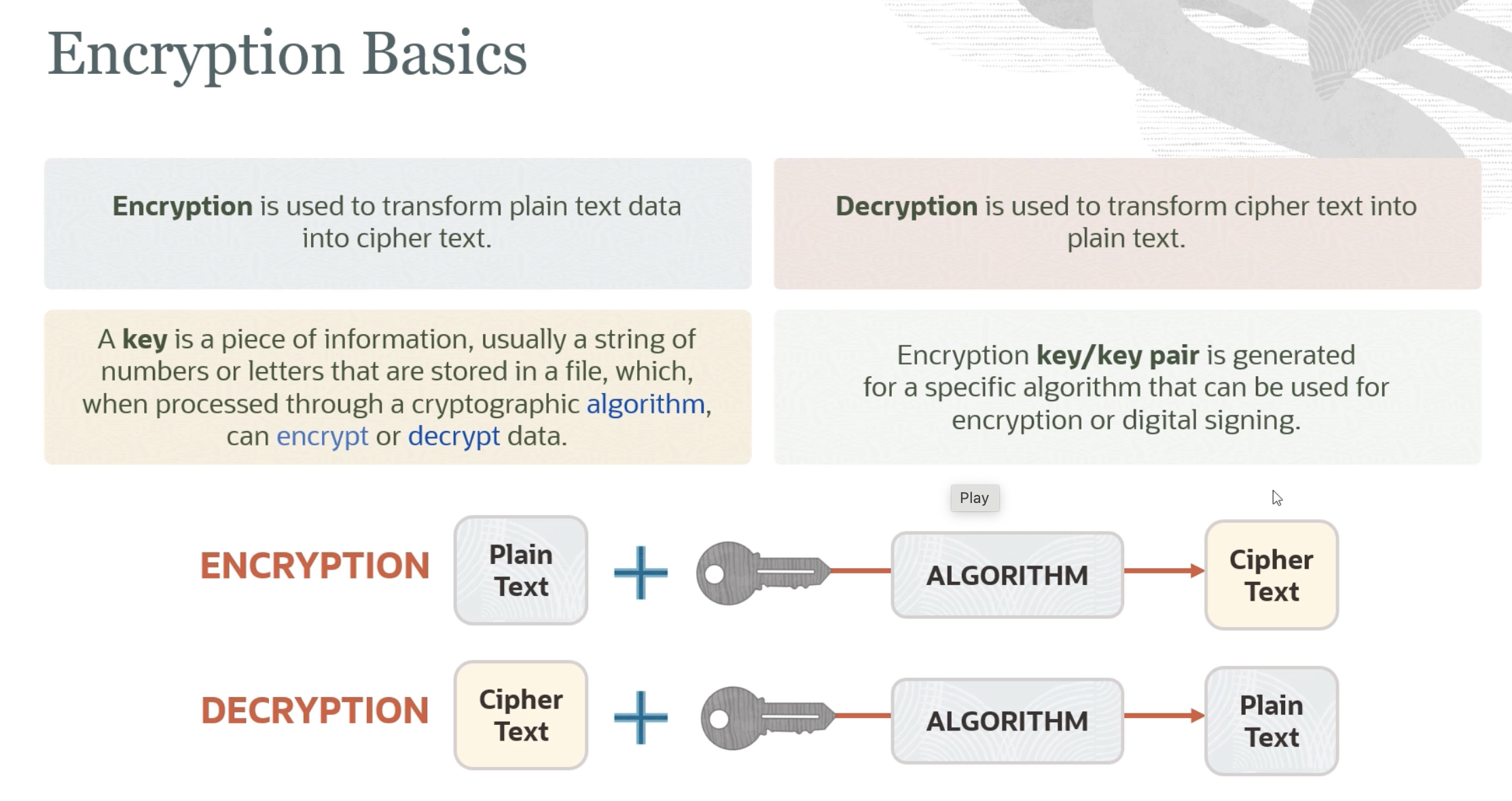 Encryption Concepts Encryption is used to transform plain text data into cipher text. Decryption is used to transform cipher text into plain text. An encryption key/key pair is generated for a specific algorithm to be used for encryption or digital signing. AES symmetric keys: The same key encrypts and decrypts data; it cannot be used for digital signing. RSA asymmetric keys: A public key encrypts and private key decrypts data; it can be used for digital signing. ECDSA keys: L Can be used only for digital signing, not for encryption and decryption of data