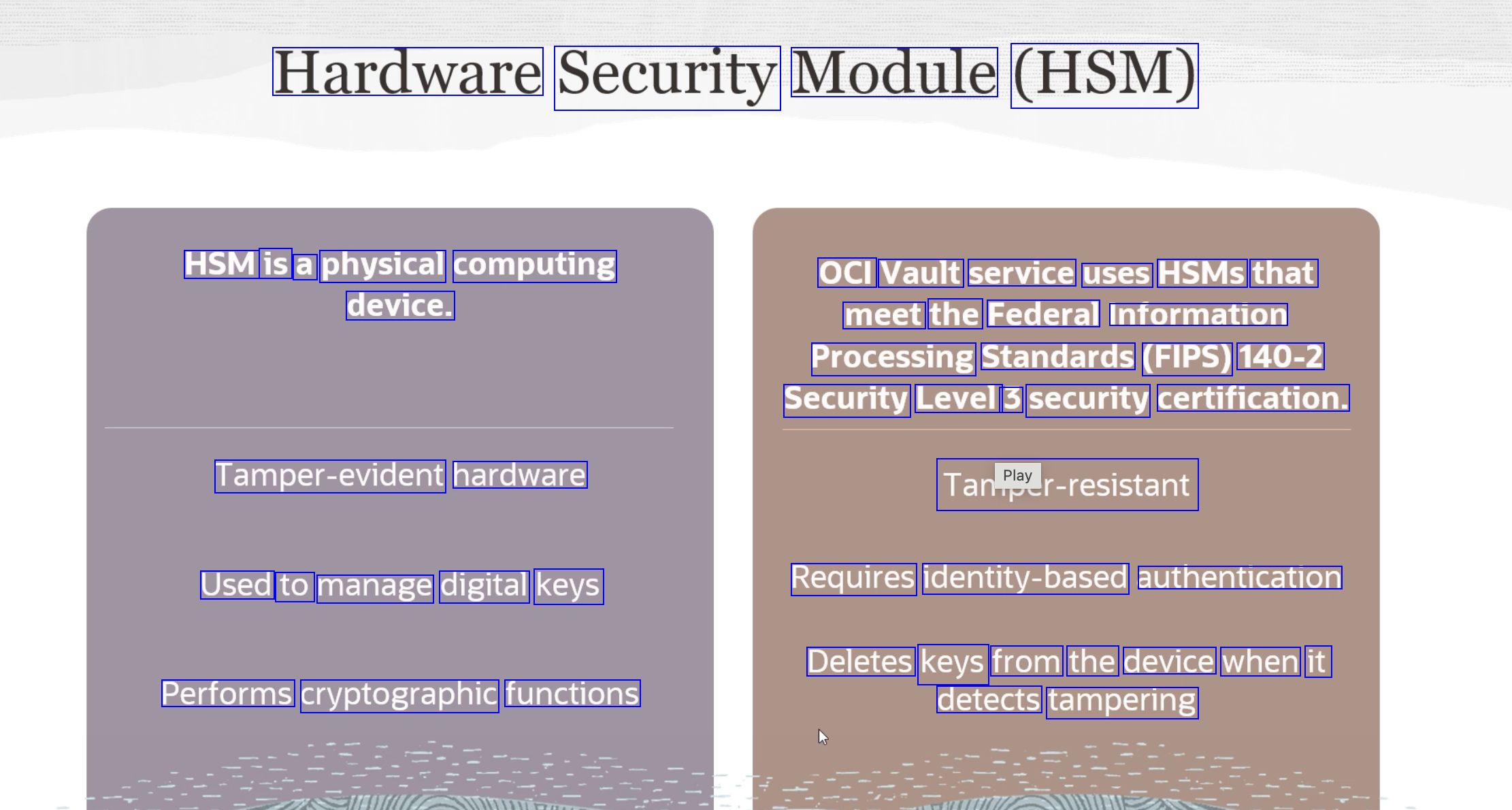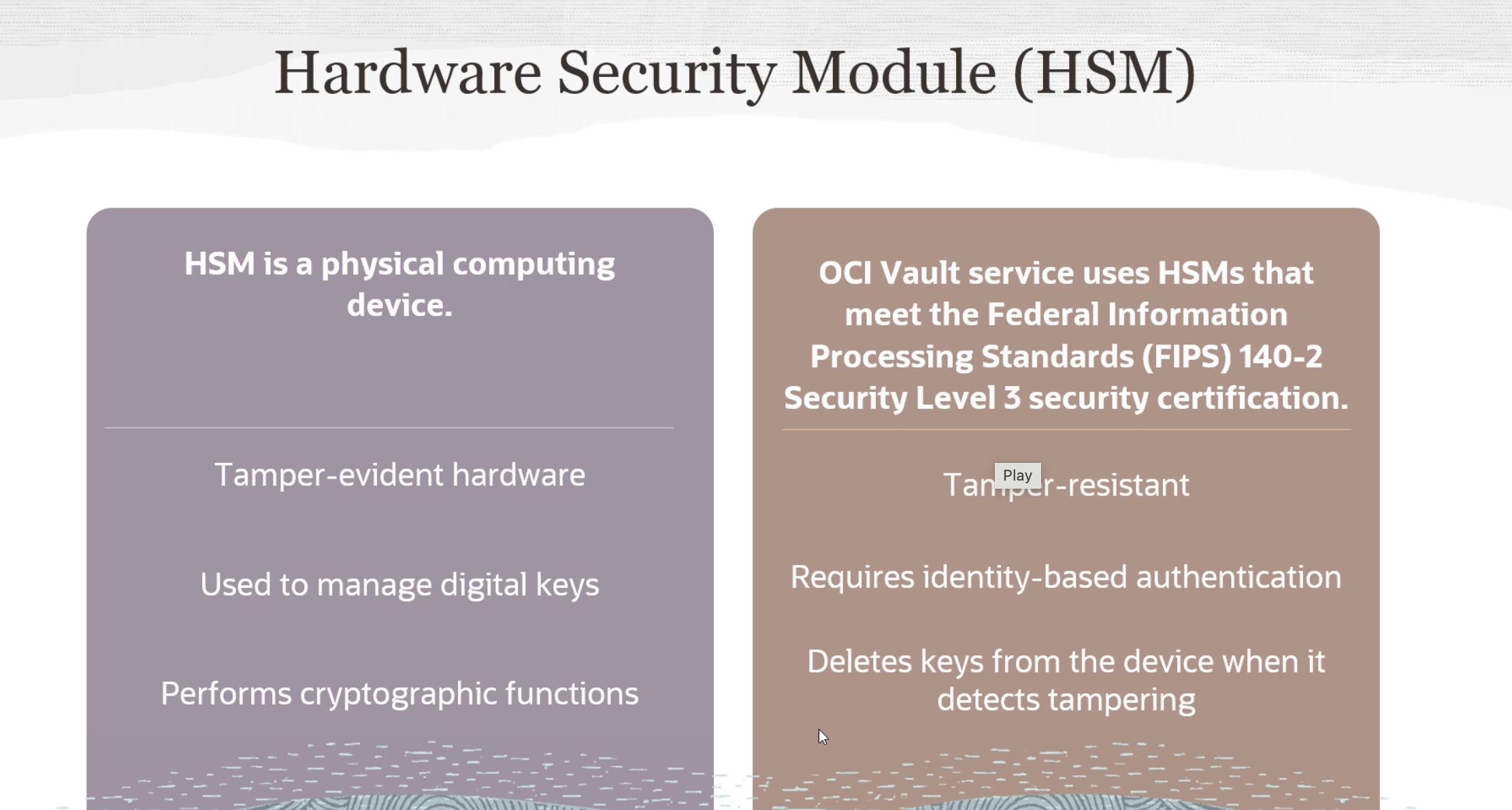 Hardware Security Module (HSM) HSM is a physical computing OCI Vault service uses HSMS that meet the Federal Information Processing Standards (FIPS) 140-2 Security Level 3 security certification. device. Tamper-evident hardware Tanlmper-resistant Used to manage digital keys Requires identity-based authentication Deletes keys from the device when it Performs cryptographic functions detects tampering