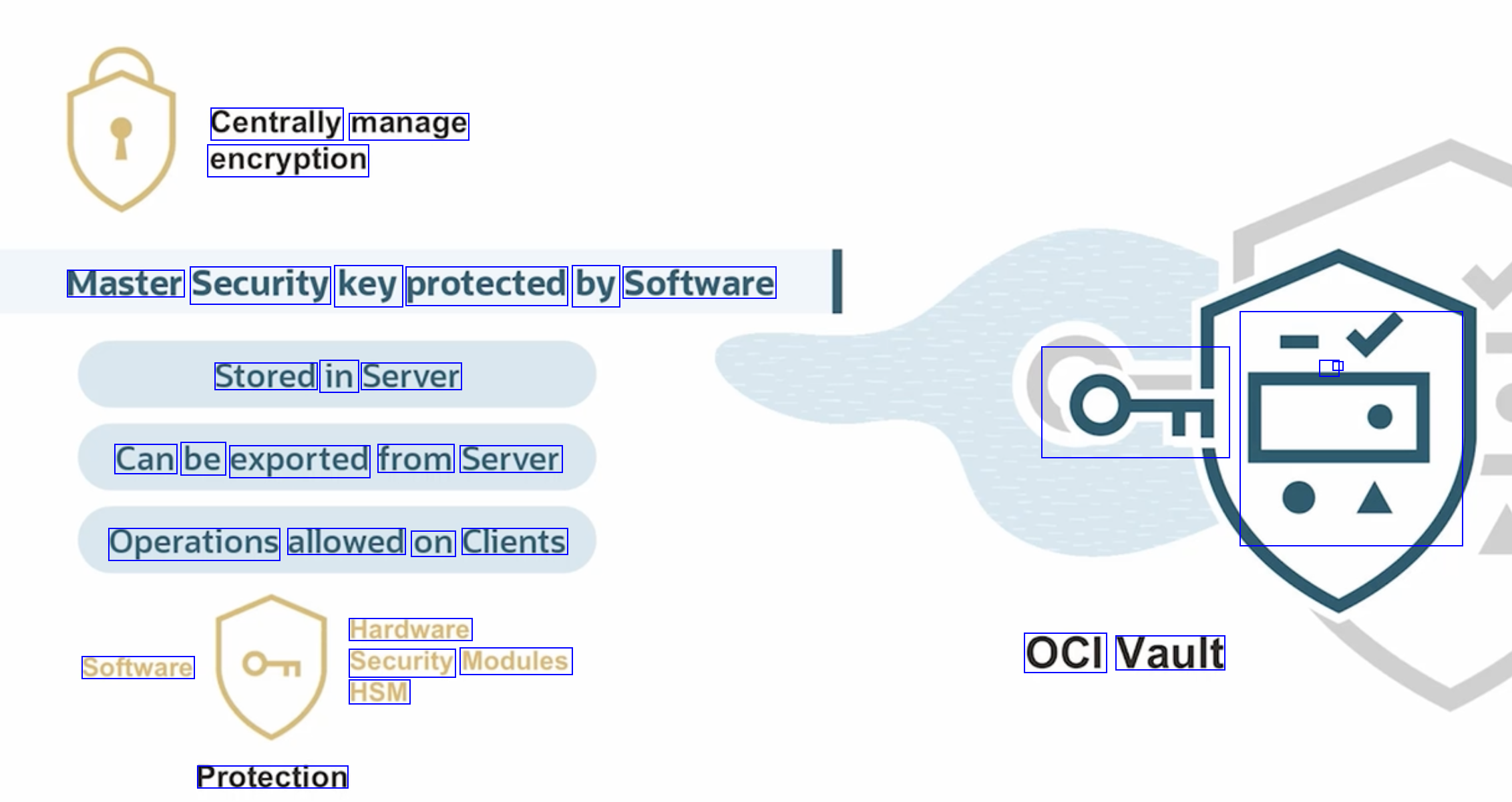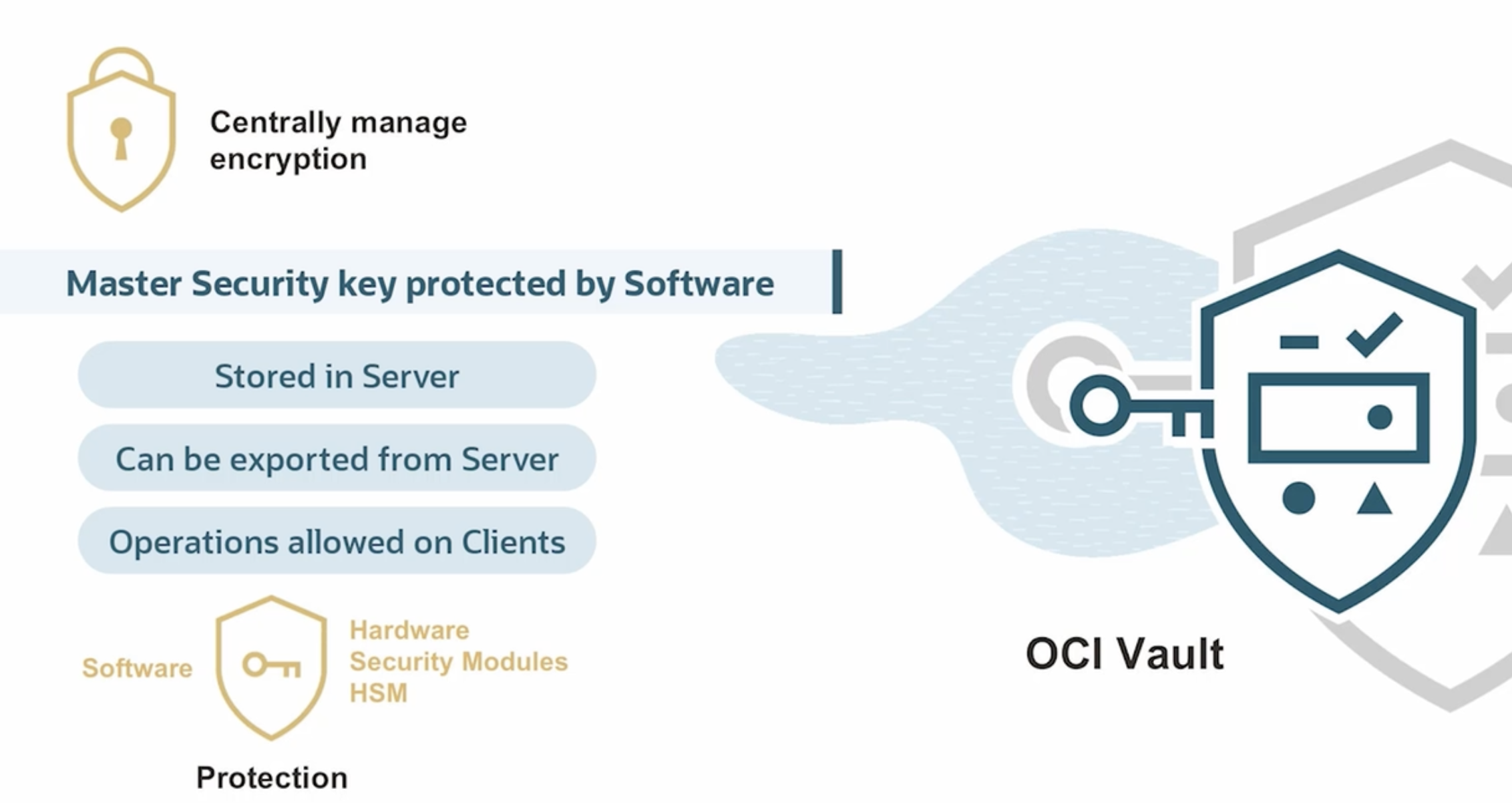 Centrally manage encryption Master Security key protected by Software Stored in Server - - OT Can be exported from Server E Operations allowed on Clients Hardware Security Modules HSM Software OCI Vault Protection
