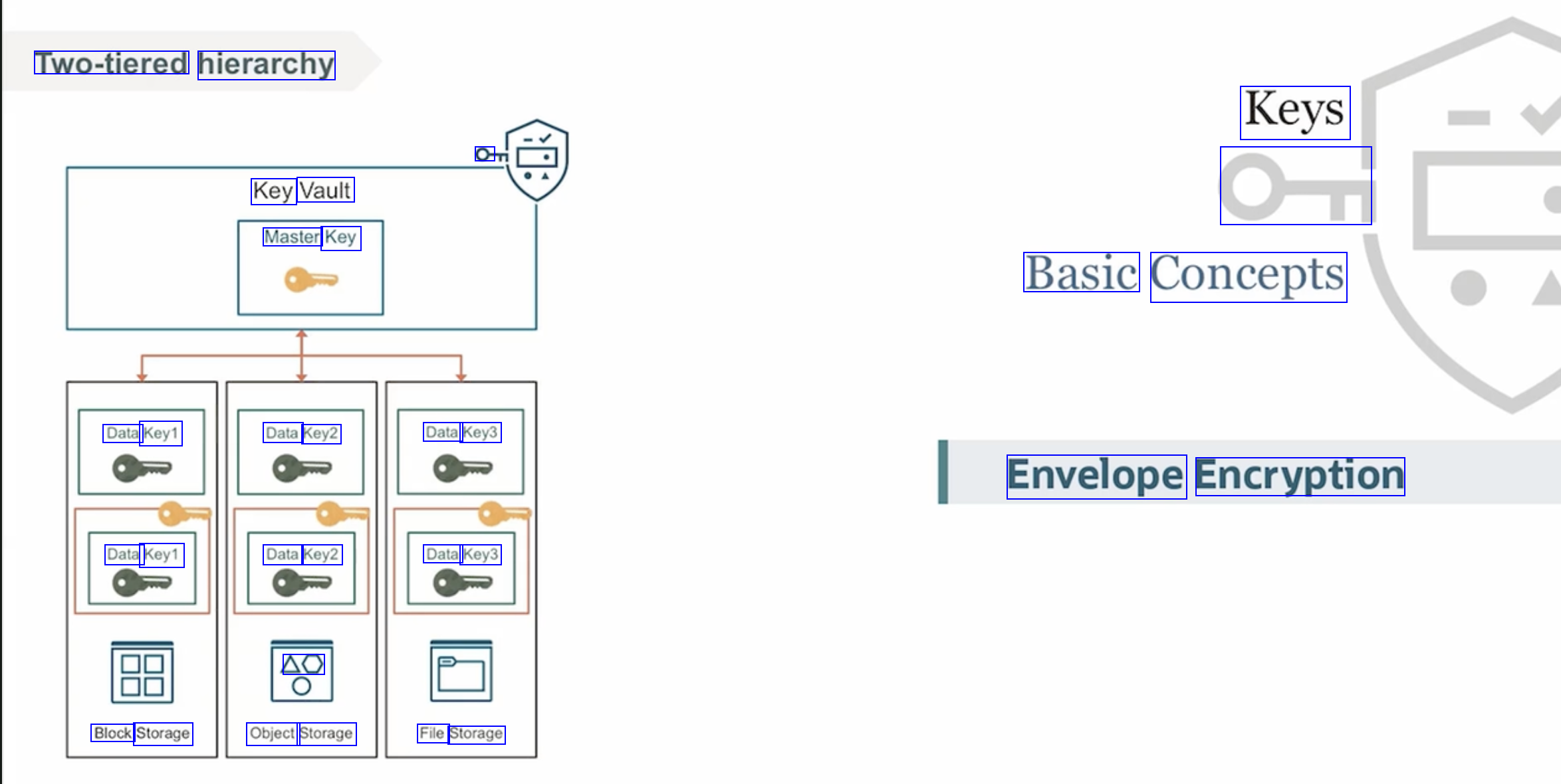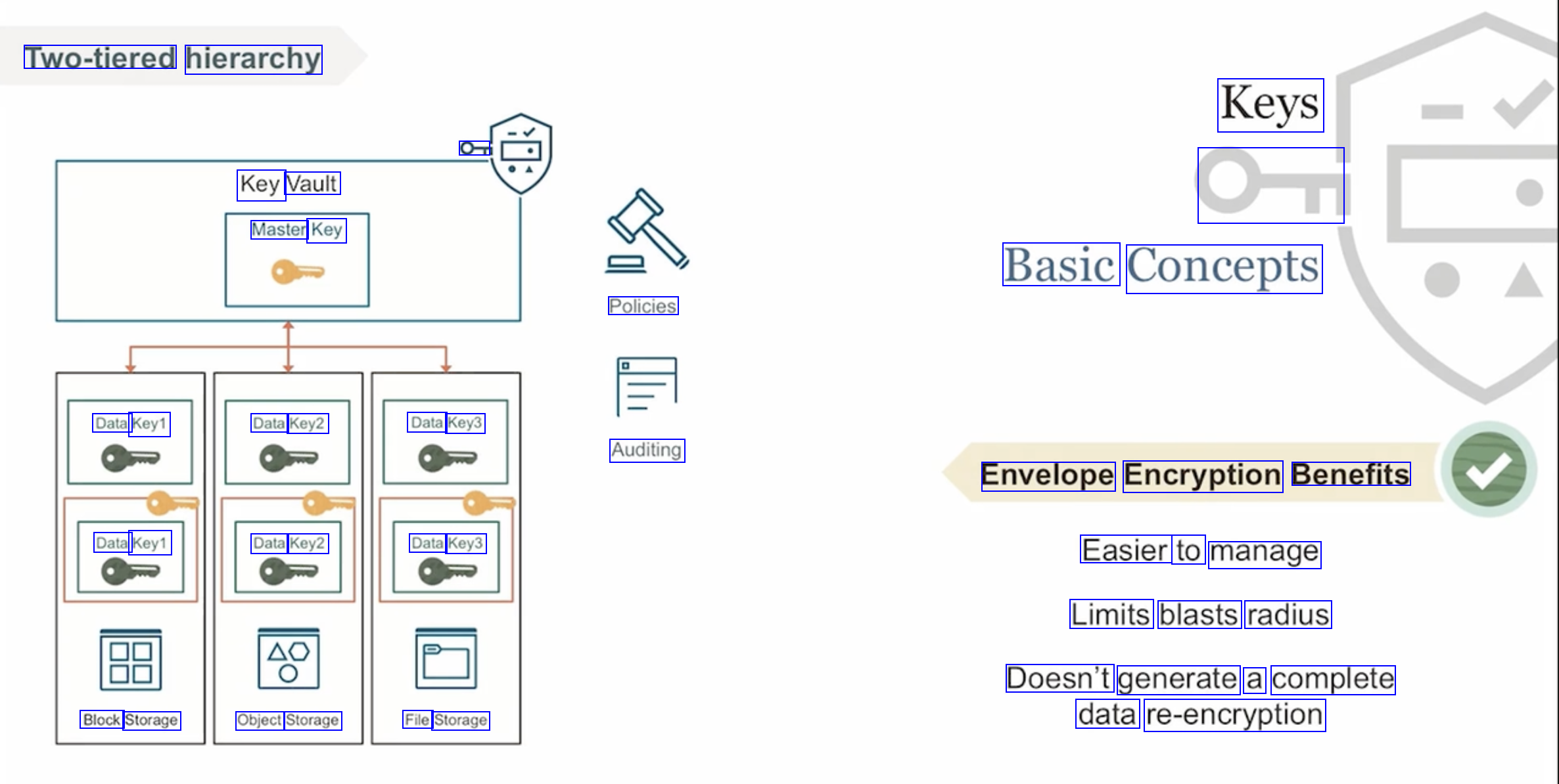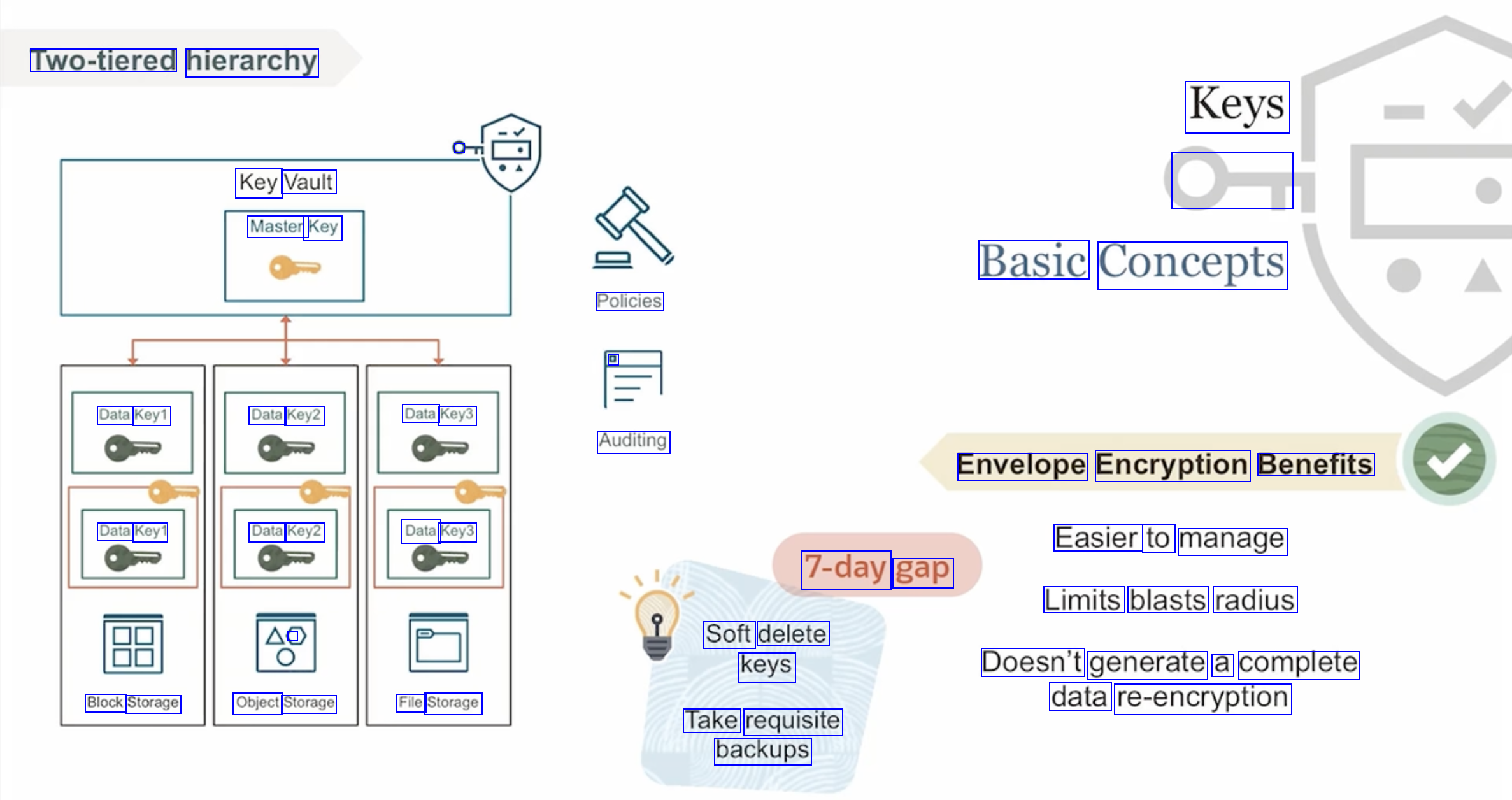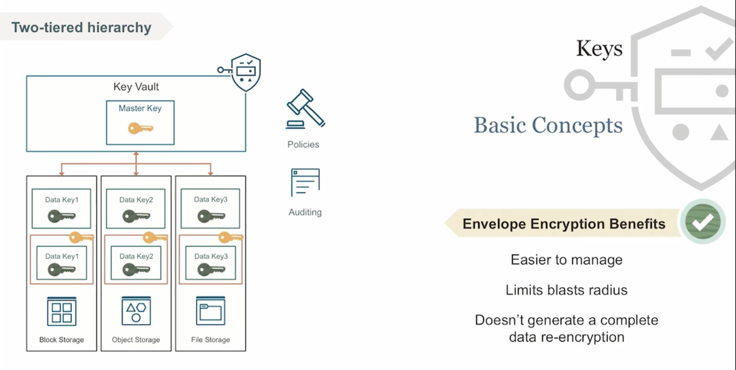 Two-tiered hierarchy Keys Key Vault Master Key O Basic Concepts Policies D Data Key1 Data Key2 Data Key3 Auditing Envelope Encryption Benefits Data Key1 Data Key2 Data Key3 Easier to manage 7-day gap Limits blasts radius ( Soft delete keys Doesn't generate a complete data re-encryption Block Storage Object Storage File Storage Take requisite backups