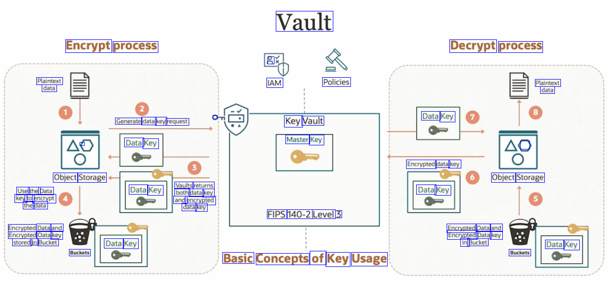 Vault Encrypt process Decrypt process 3 Plaintext data IAM Policies Plaintext data 0 Data Key Generate data key request Key Vault Master Key - Data Key - Encrypted data key Object Storage Object Storage Vaults returns Data Key both data key and encrypted data key Use the Data key to encrypt the data Data Key FIPS 140-2 Level 3 Encrypted Data and Encrypted Data key stored in Bucket Encrypted Data and Encrypted Data key in Bucket Data Key Data Key Buckets Buckets Basic Concepts of Key Usage