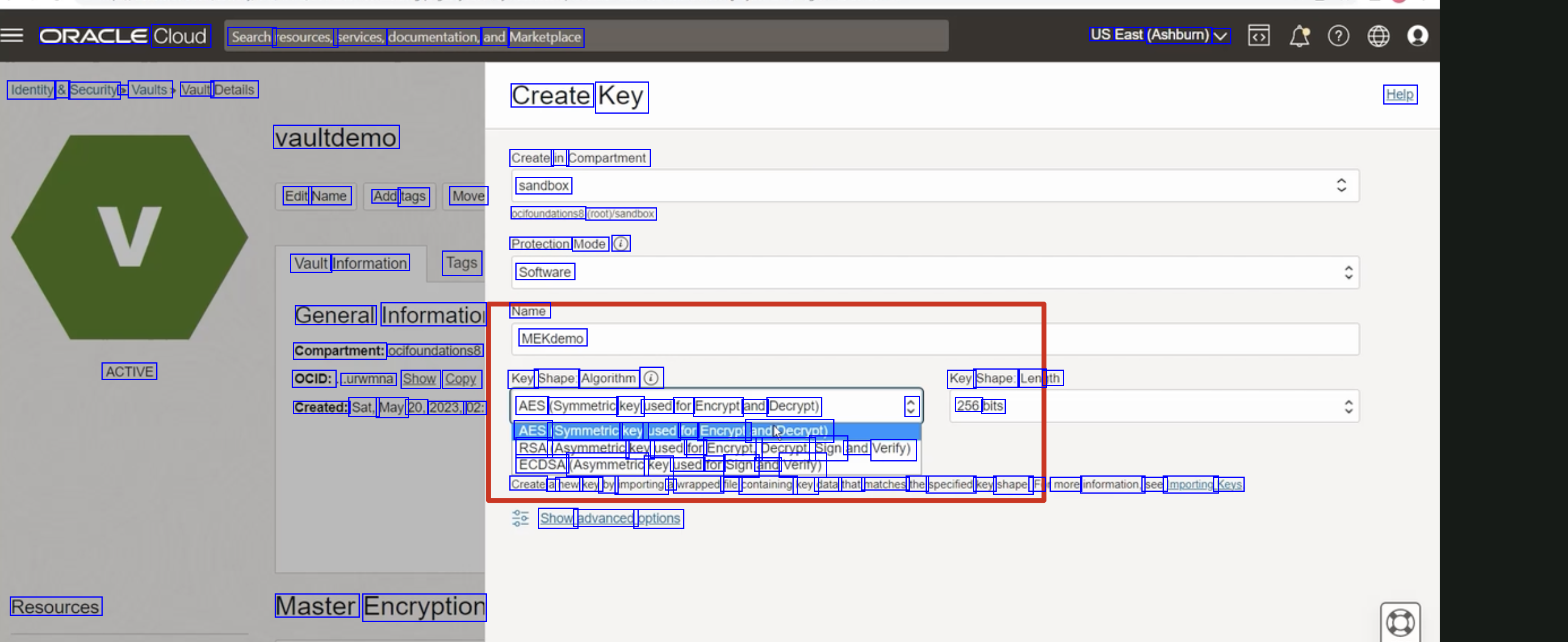 ORACLE Cloud Search resources, services, documentation, and Marketplace US East (Ashbumn) V Identity & Security > Vaults Vault Details Create Key Help vaultdemo Create in Compartment sandbox ocifoundations8 (rooty/sandbox Protection Mode 0 Software Edit Name Add tags Move Vault Information Tags General Information Name Compartment: ocifoundations8 MEKdemo ACTIVE OCID: .urwmna Show Copy Key Shape: Algorithm 0 Key Shape: Len th C 256 bits Created: Sat, May 20, 2023, 02: AES (Symmetric key used for Encrypt and Decrypt) AES (Symmetric key used for Encrypt andpecrypt) RSA (Asymmetric key used for Encrypt, Decrypt, Sign and Verify) ECDSA (Asymmetric key used for Sign and Verify) Create a new key by importing a wrapped file containing key data that matches the specified key shape. F more information, see Importing Keys Show advanced options Resources Master Encryption