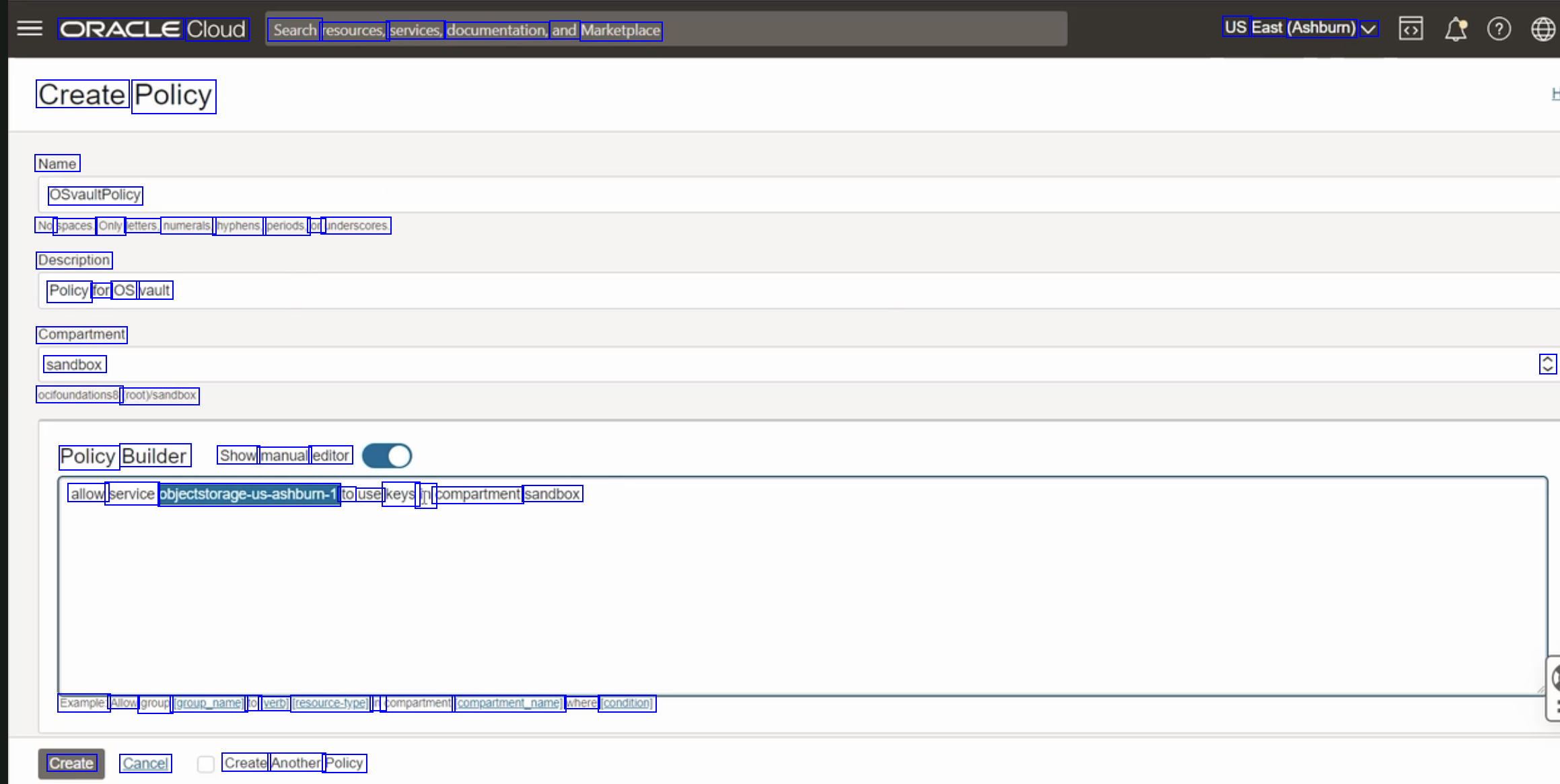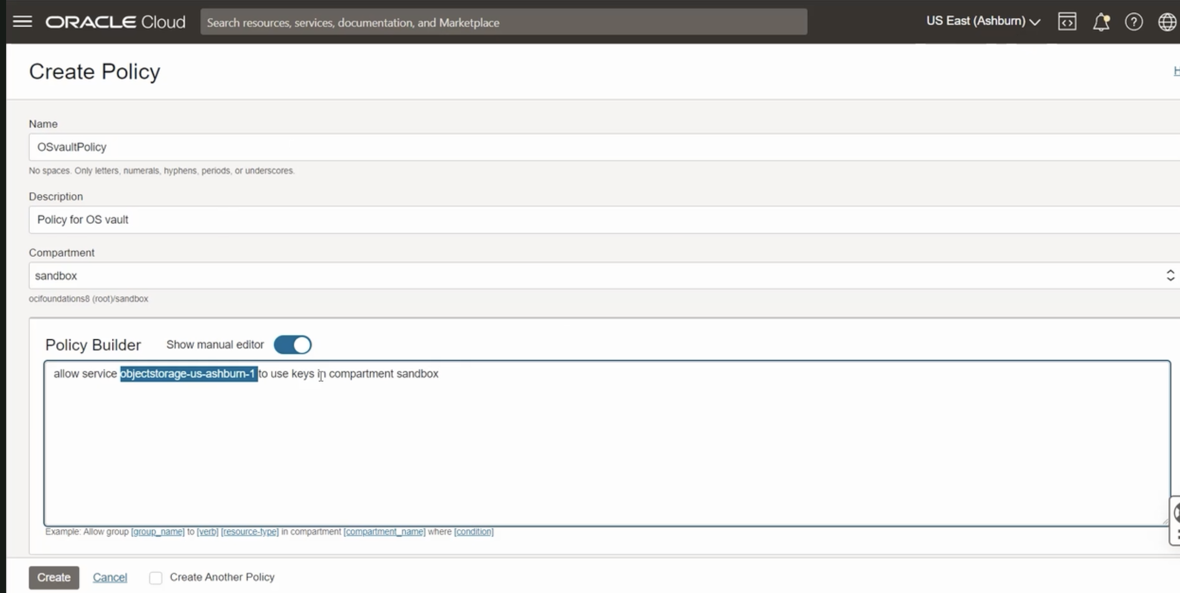 ORACLE Cloud Search resources, services, documentation, and Marketplace US East (Ashburn) V Create Policy Name OSvaultPolicy No spaces. Only letters, numerals, hyphens, periods, or underscores. Description Policy for OS vault Compartment sandbox ocifoundationss (rootysandbox C Policy Builder Show manual editor allow service obiectslorngeus-amhbum1 to use keys in compartment sandbox Example: Allow group (group_name] to [verb] (resource-ype) in compartment Ccomparimenunamel where (condition) Create Cancel Create Another Policy