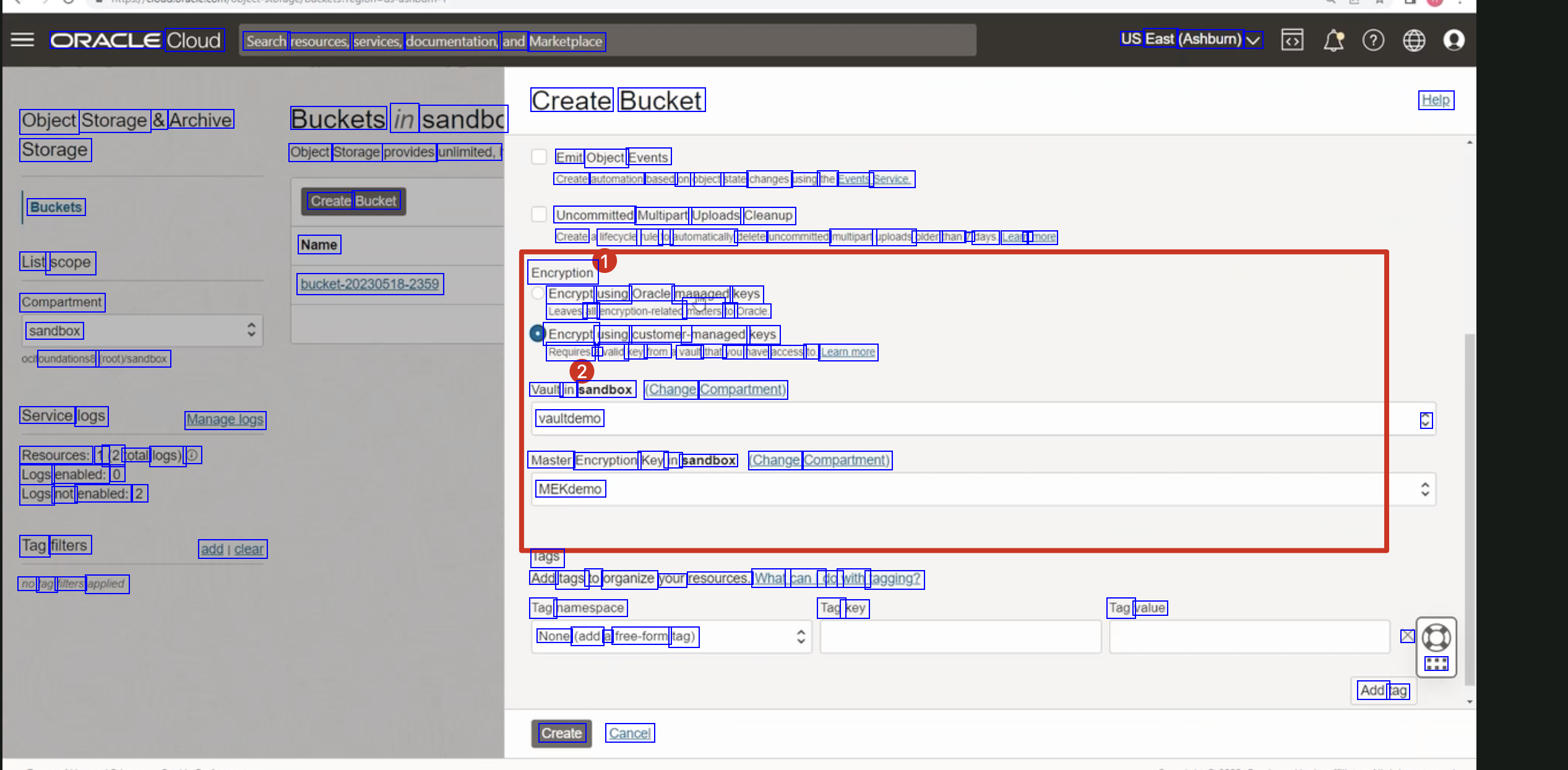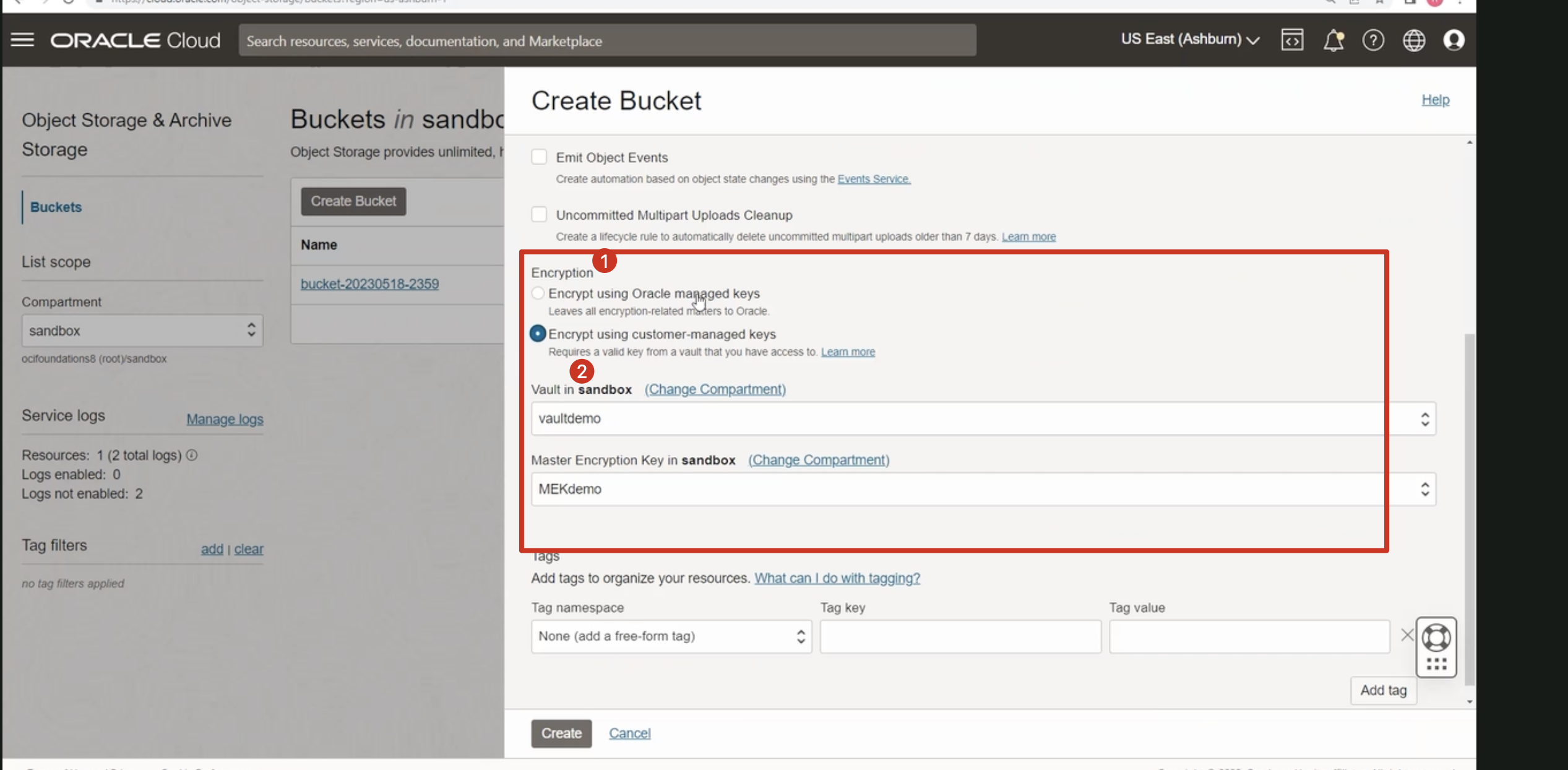 ORACLE Cloud Search resources, services, documentation, and Marketplace US East (Ashburn) V Create Bucket Help Object Storage & Archive Storage Buckets in sandbo Object Storage provides unlimited, Create Bucket Name Emit Object Events Create automation based on object state changes using the Events Service. Uncommitted Multipart Uploads Cleanup Buckets Create lifecycle rule to automatically delete uncommitted multipart uploads older than 7 days. Leam n more List scope Compartment sandbox oundations8 (rooty/sandbox Encryption bucket.20230518.:2359 Encrypt using Oracle managed keys Leaves all encryption-related maters to Oracle. Encrypt using customer- r-managed keys Requires a valid key from vault that you have access to. Leammore Vault in sandbox (Change Compartment) vaultdemo Service logs Resources: 1 (2 total logs) 0 Logs enabled: 0 Logs not enabled: 2 Managelogs C Master Encryption Key in sandbox (Change Compartment) MEKdemo Tag filters no tag filters applied addiclear Tags Add tags to organize your resources. What canl do with tagging? Tag namespace None (add a free-form tag) Tag key Tag value X ::: Add tag Create Cancel