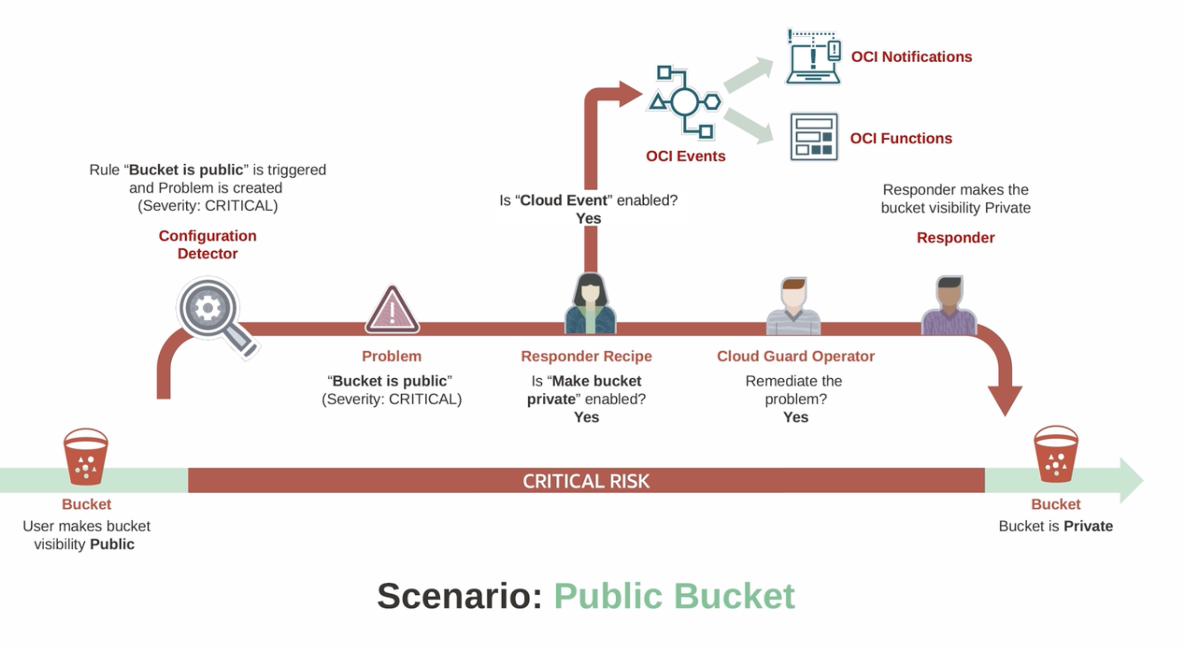 OCI Notifications C OCI Functions OCI Events Rule "Bucket is public" is triggered and Problem is created (Severity: CRITICAL) Configuration Detector Responder makes the bucket visibility Private Responder Is "Cloud Event" enabled? Yes Problem "Bucket is public" (Severity: CRITICAL) Responder Recipe Is "Make bucket private" enabled? Yes Cloud Guard Operator Remediate the problem? Yes CRITICAL RISK Bucket User makes bucket visibility Public Bucket Bucket is Private Scenario: Public Bucket