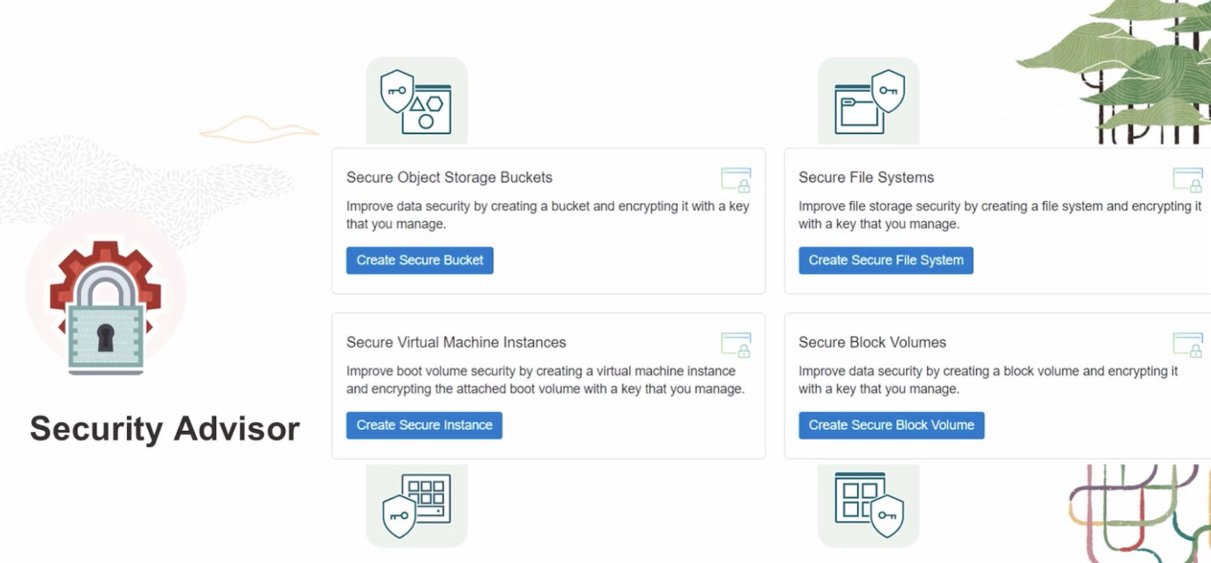rO C On Hemt Secure Object Storage Buckets Secure File Systems Improve data security by creating a bucket and encrypting it with a key Improve file storage security by creating a file system and encrypting it that you manage. with a key that you manage. Create Secure Bucket Create Secure File System a Secure Virtual Machine Instances Secure Block Volumes la Improve boot volume security by creating a virtual machine instance and encrypting the attached boot volume with a key that you manage. Improve data security by creating a block volume and encrypting it with a key that you manage. Security Advisor Create Secure Instance Create Secure Block Volume On